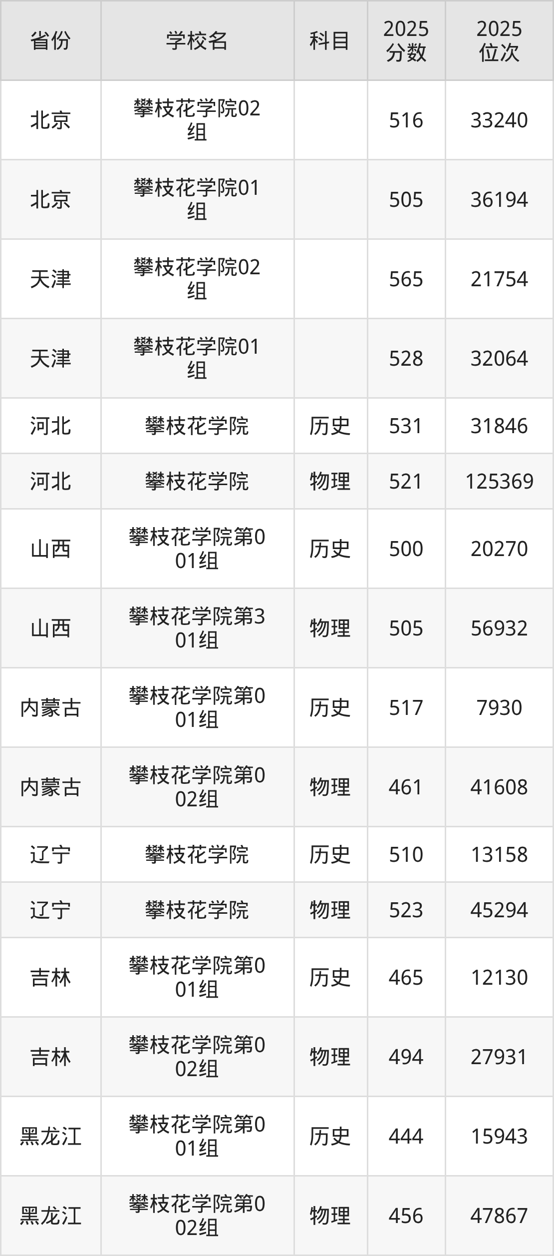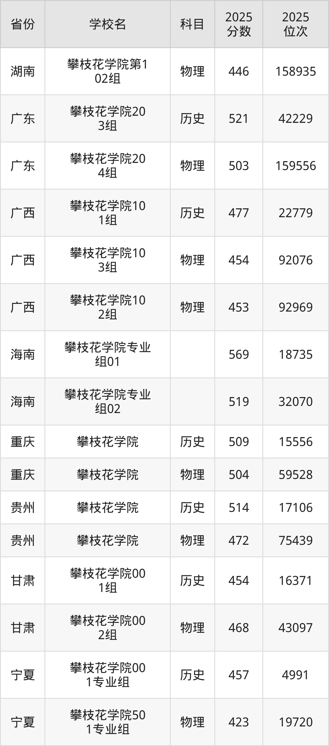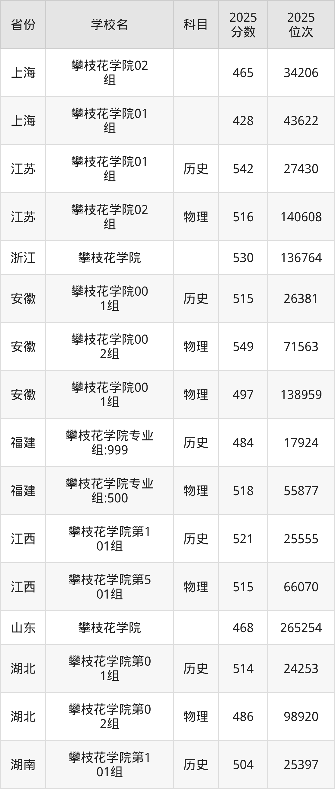 | 攀枝花学院专业 组202 | 物理 | 495 | 134050 |