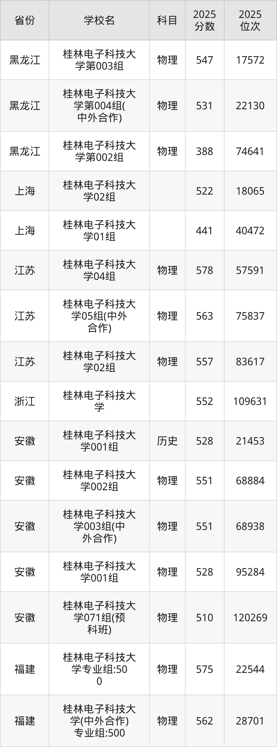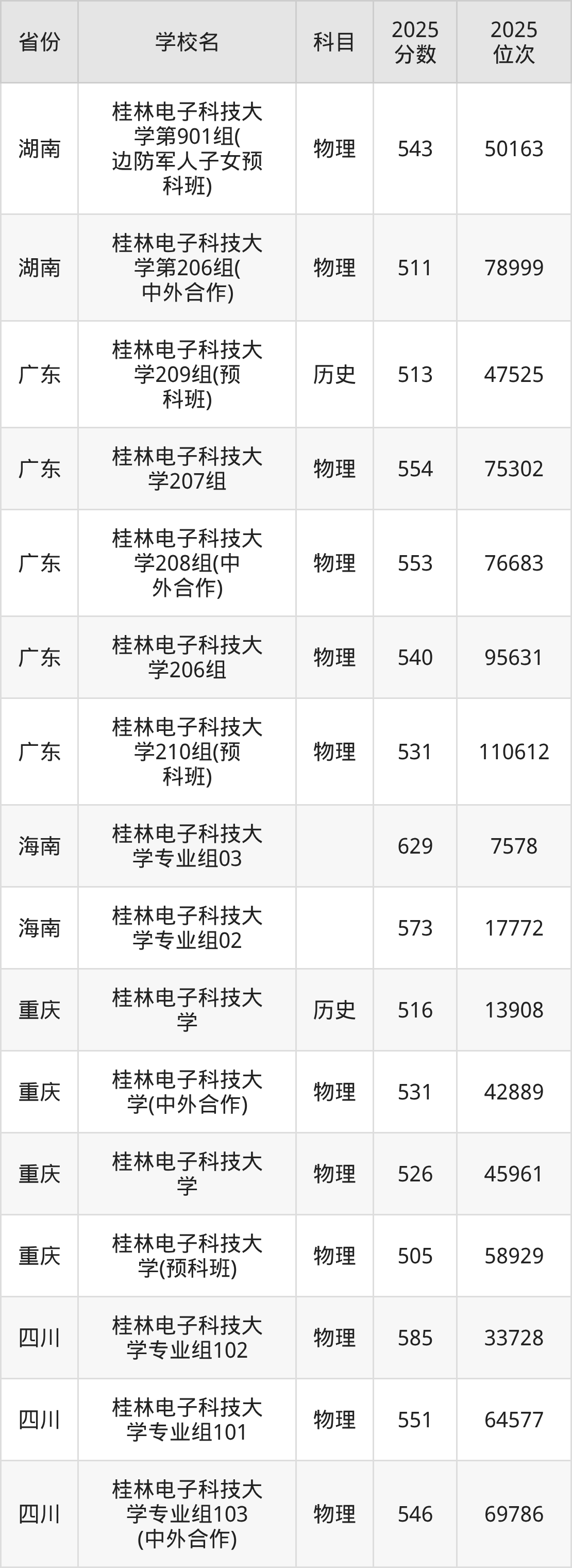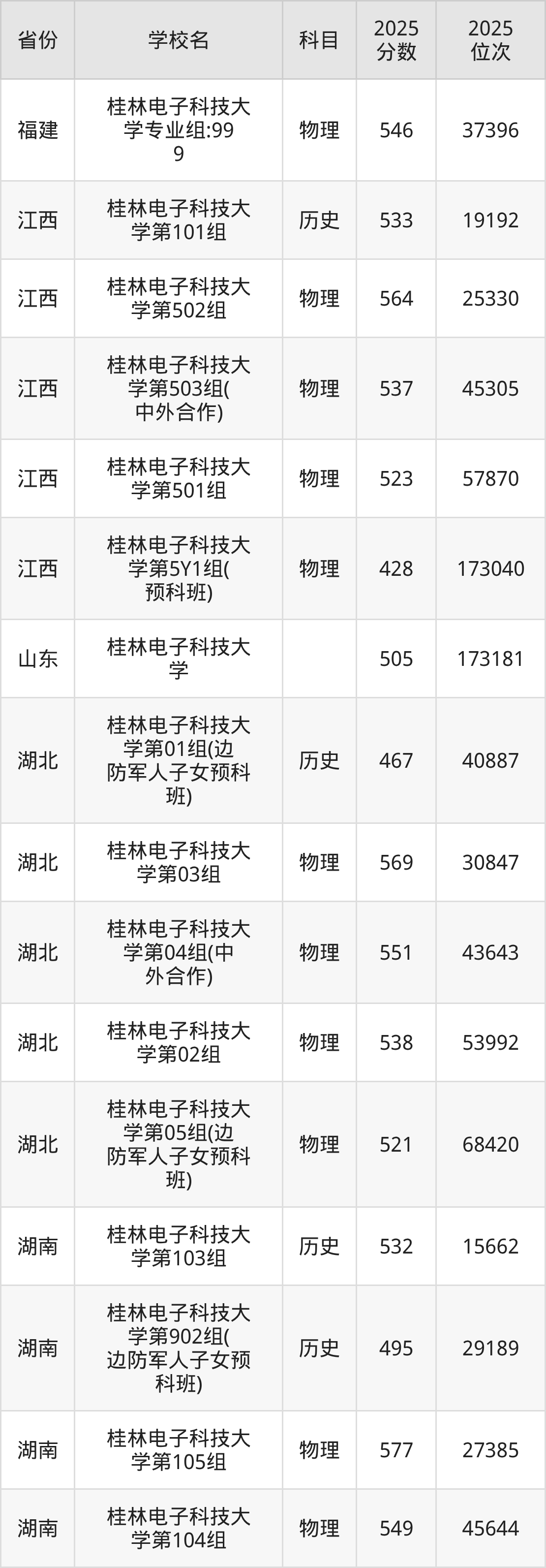 | 桂林电子科技大 学552组(国 家专项) | 物理 | 543 | 28118 |