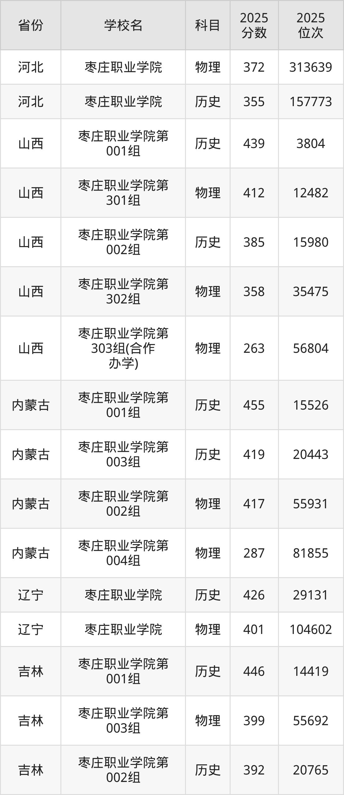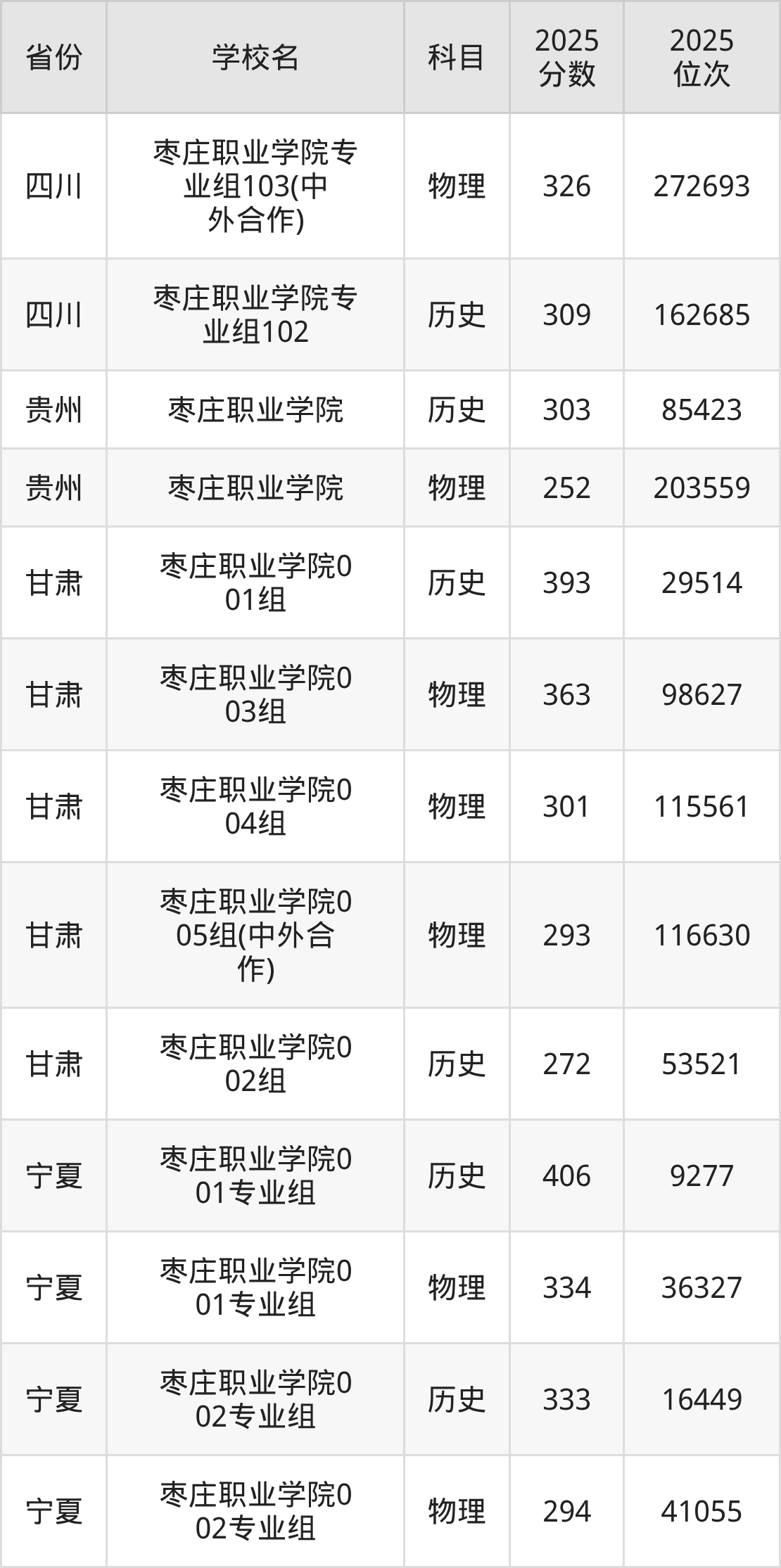 2026年枣庄职业学院录取分数线预计在360分及以上,在各省录取最低分存在一定差异,如:2025年枣庄职业学院在广西录取最低历史类359分、物理类320分,在四川录取最低历史类309分、物理类326分,在宁夏录取最低历史类333分、物理类294分。