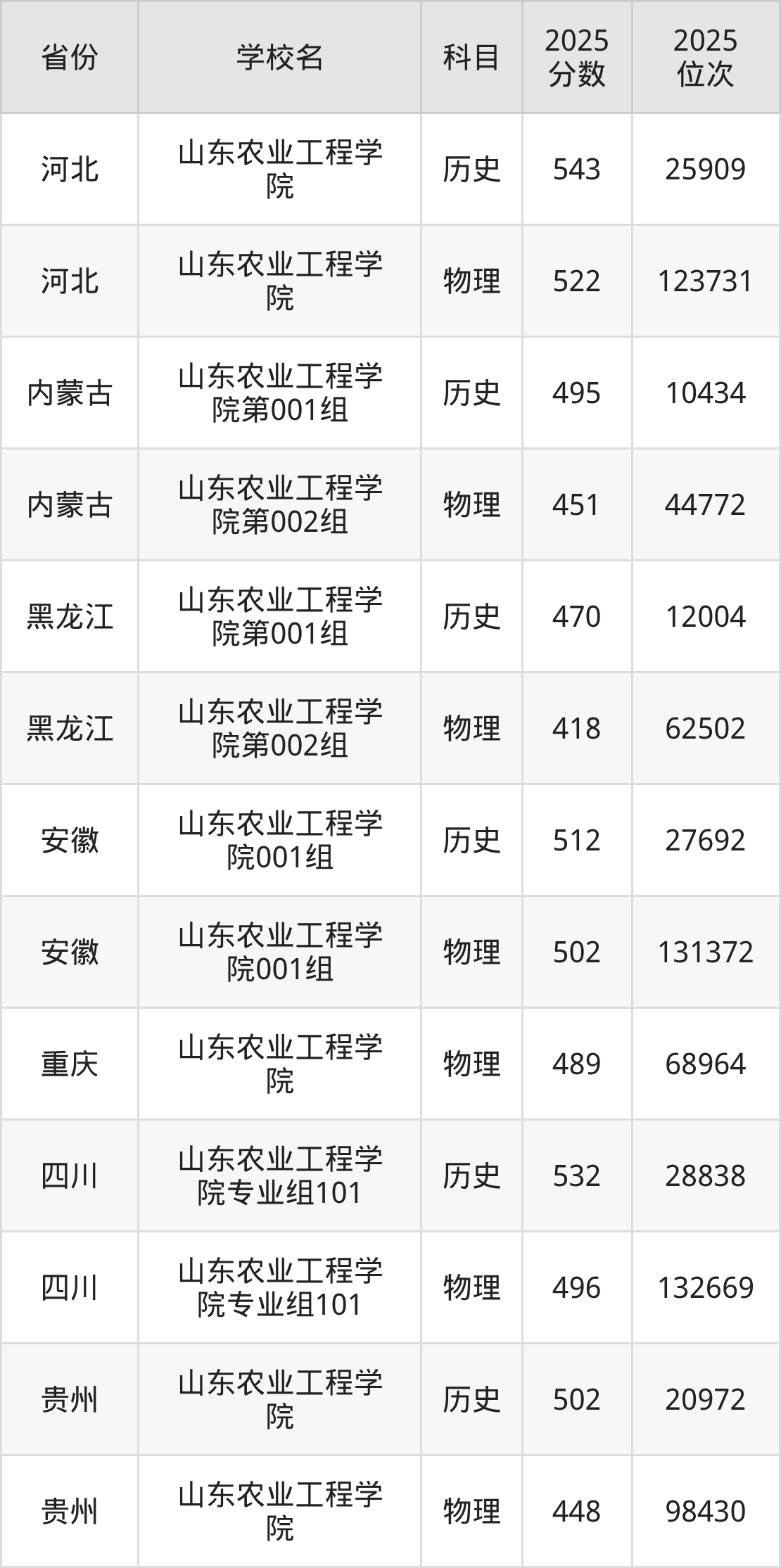 2026年山东农业工程学院录取分数线预计在480分及以上,在各省录取最低分存在一定差异,如:2025年山东农业工程学院在安徽录取最低历史类512分、物理类502分,在山东录取最低分是424分,在重庆录取最低物理类489分。