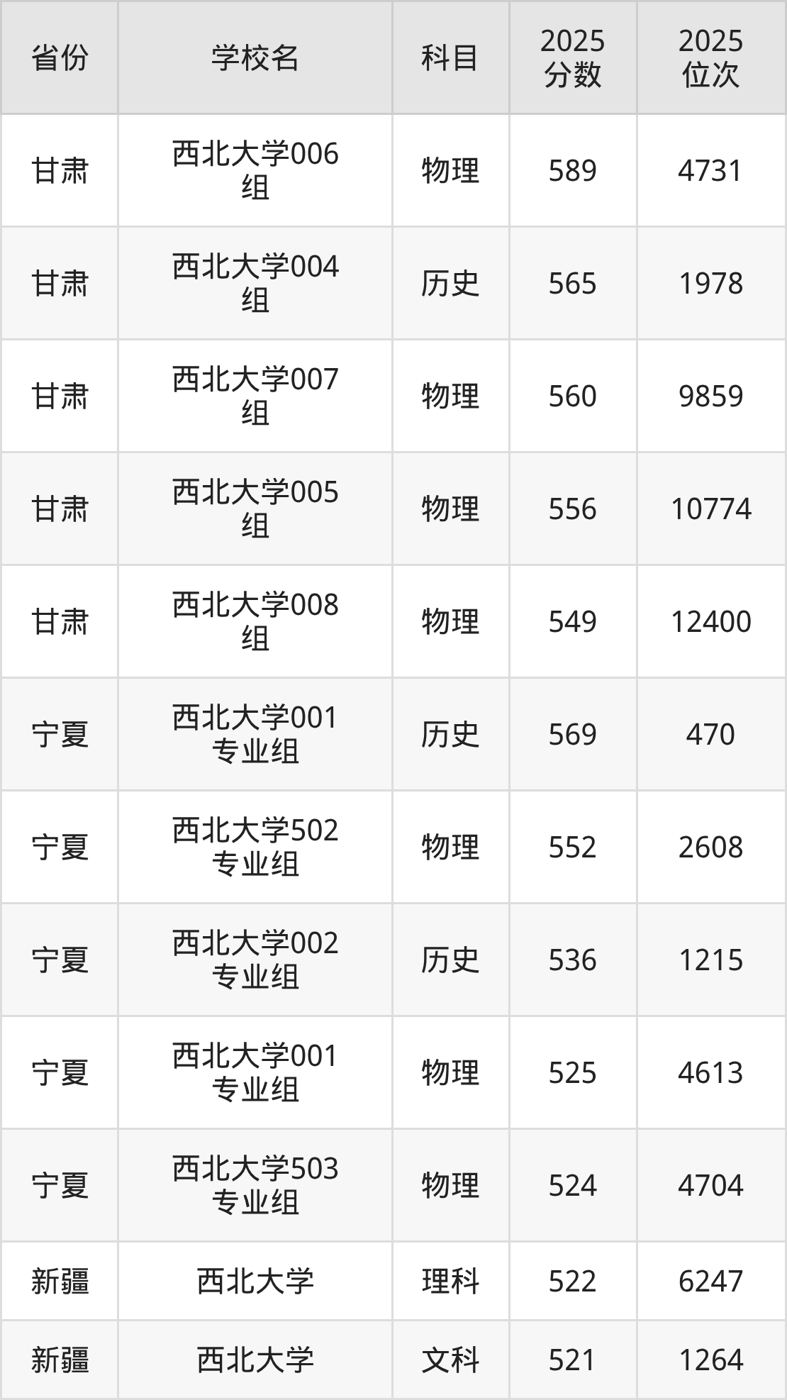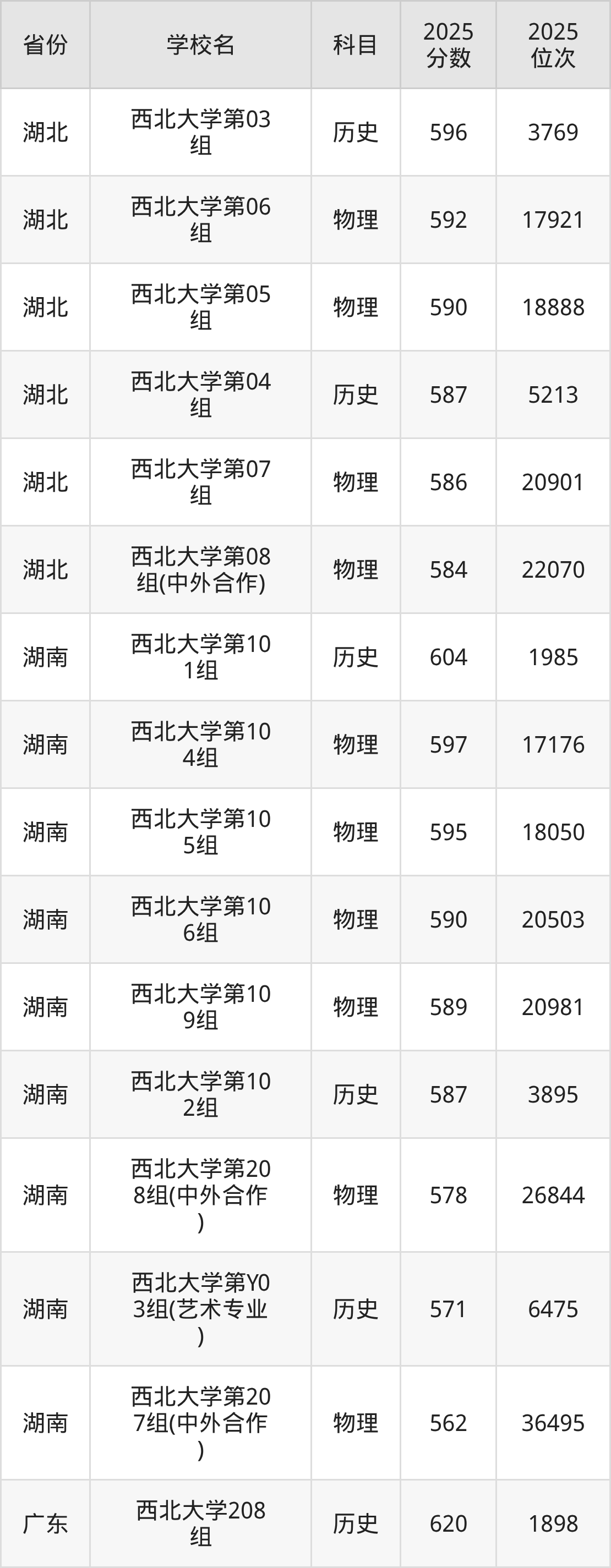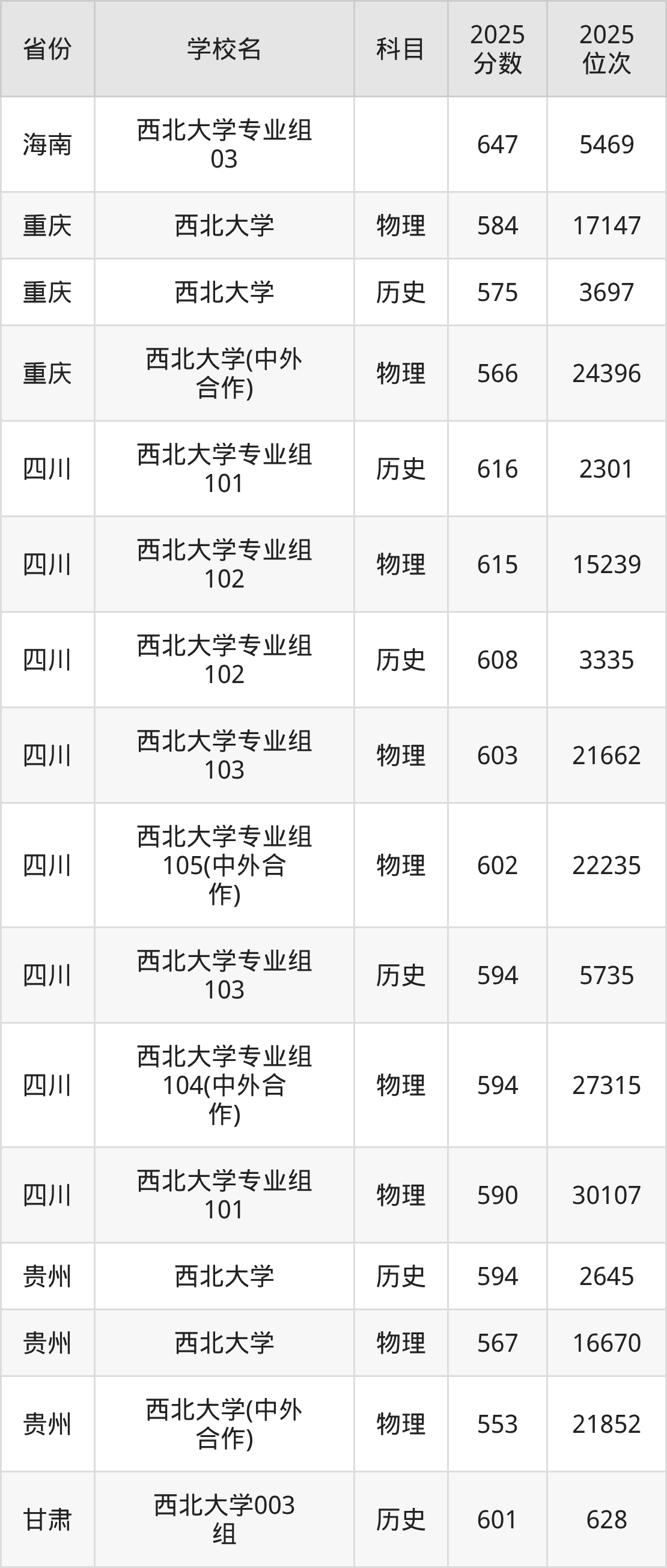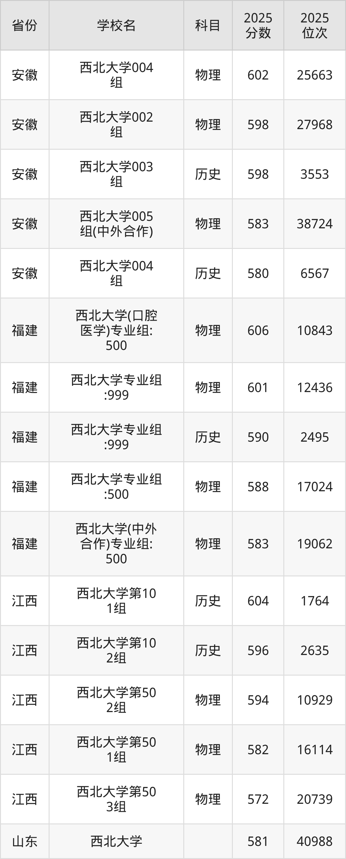 2025年西北大学历史类最低分596分(6980名)、物理类最低分586分(38943名)。