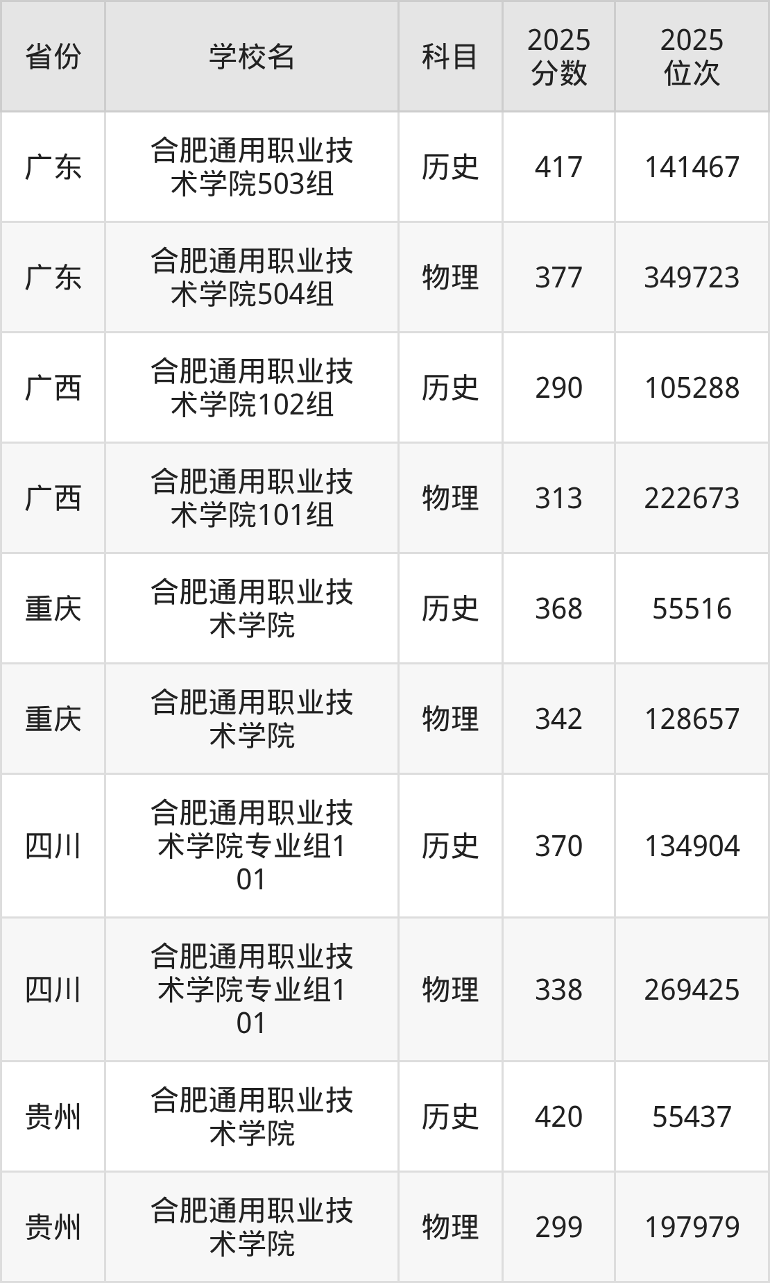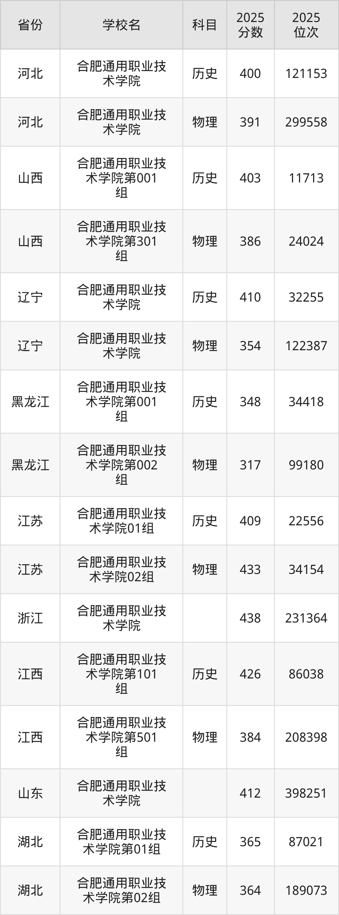 2025年合肥通用职业技术学院历史类最低分402分(83800名)、物理类最低分408分(250676名)。