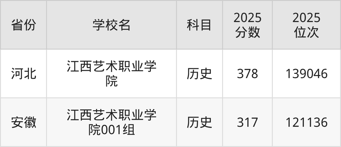 2025年江西艺术职业学院在省内分历史物理科目类录取,其中历史类最低分是385分、对应位次是114226名;物理类最低分是303分,对应位次是245333名。