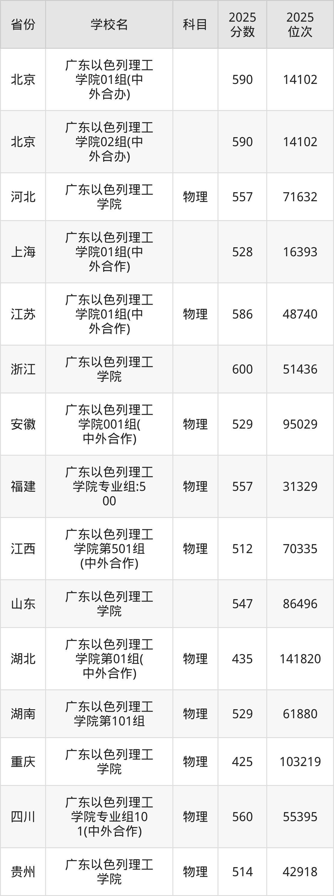 2025年广东以色列理工学院物理类最低分539分(96842名)。