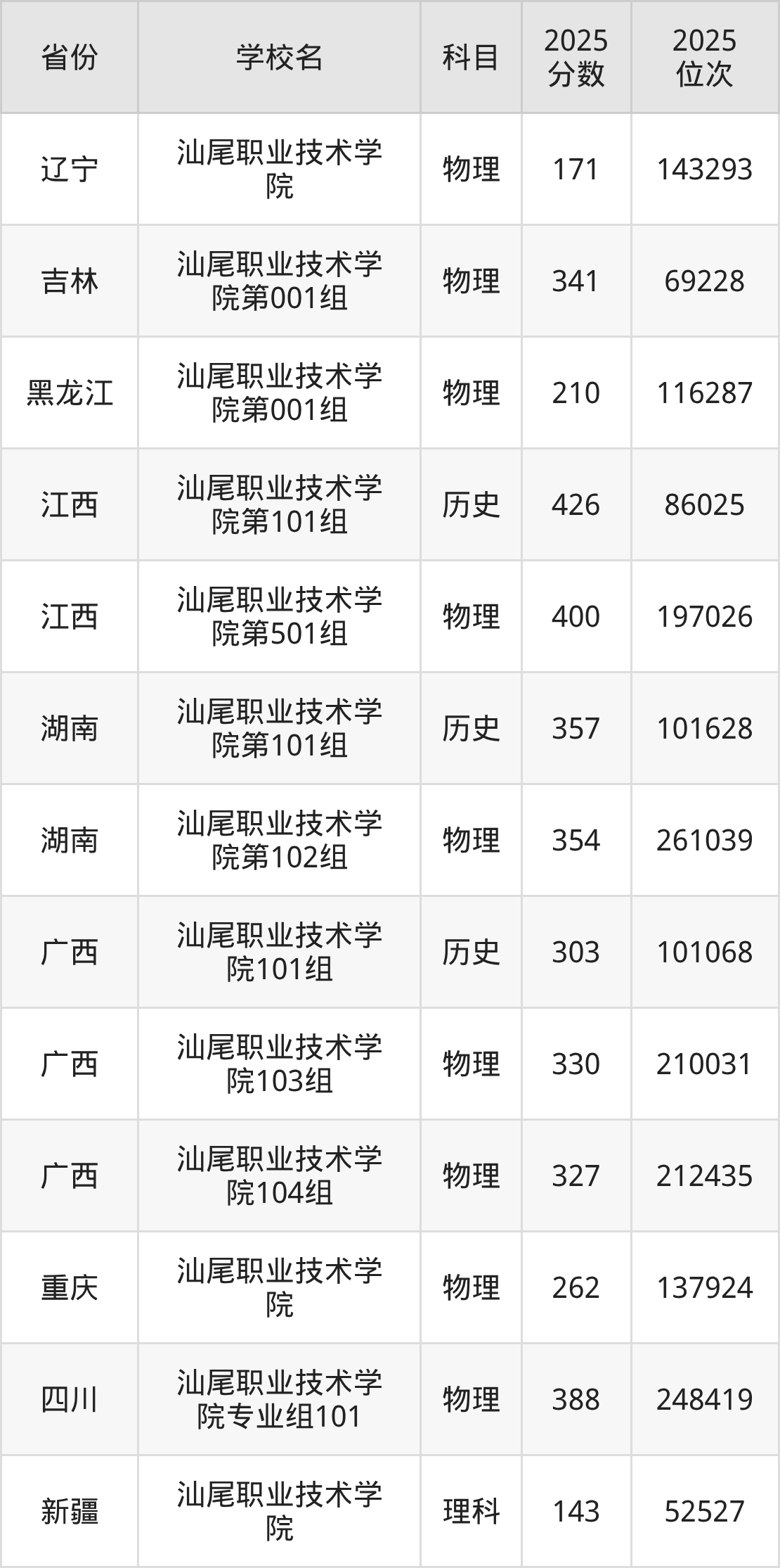 下面是汕尾职业技术学院2025年录取分数线各省汇总,一起来了解下吧。