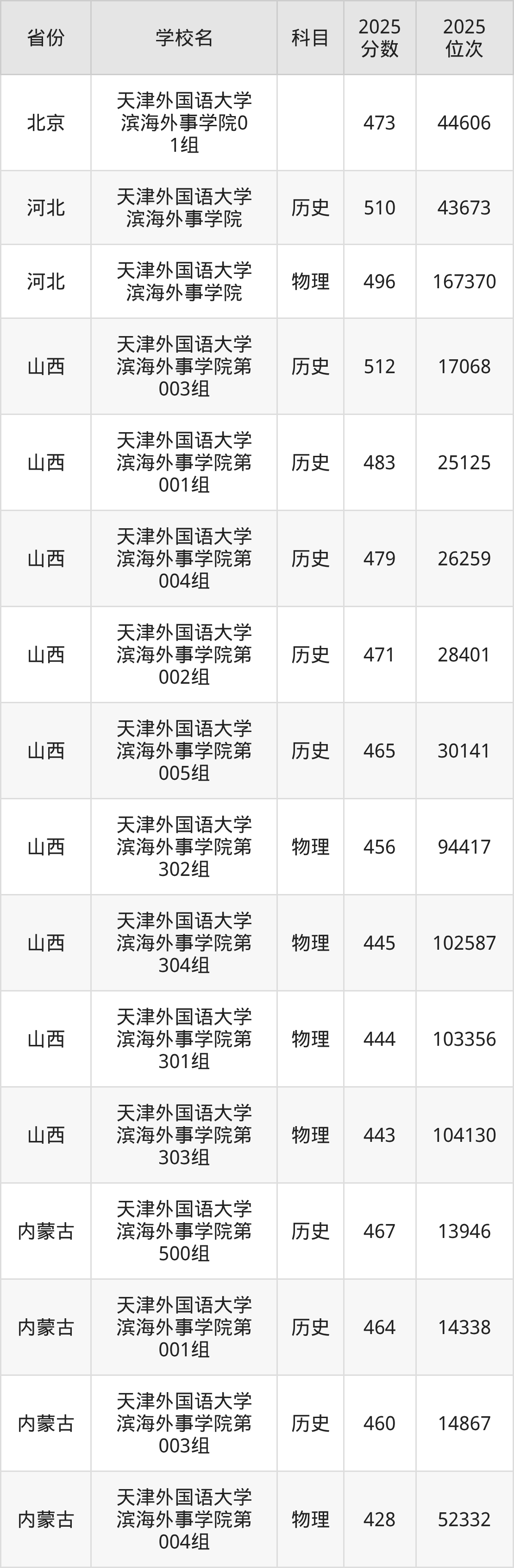 2026年天津外国语大学滨海外事学院录取分数线预计在460分及以上,在各省录取最低分存在一定差异,如:2025年天津外国语大学滨海外事学院在北京录取最低分是473分,在江苏录取最低历史类497分、物理类482分,在江西录取最低历史类510分、物理类447分。