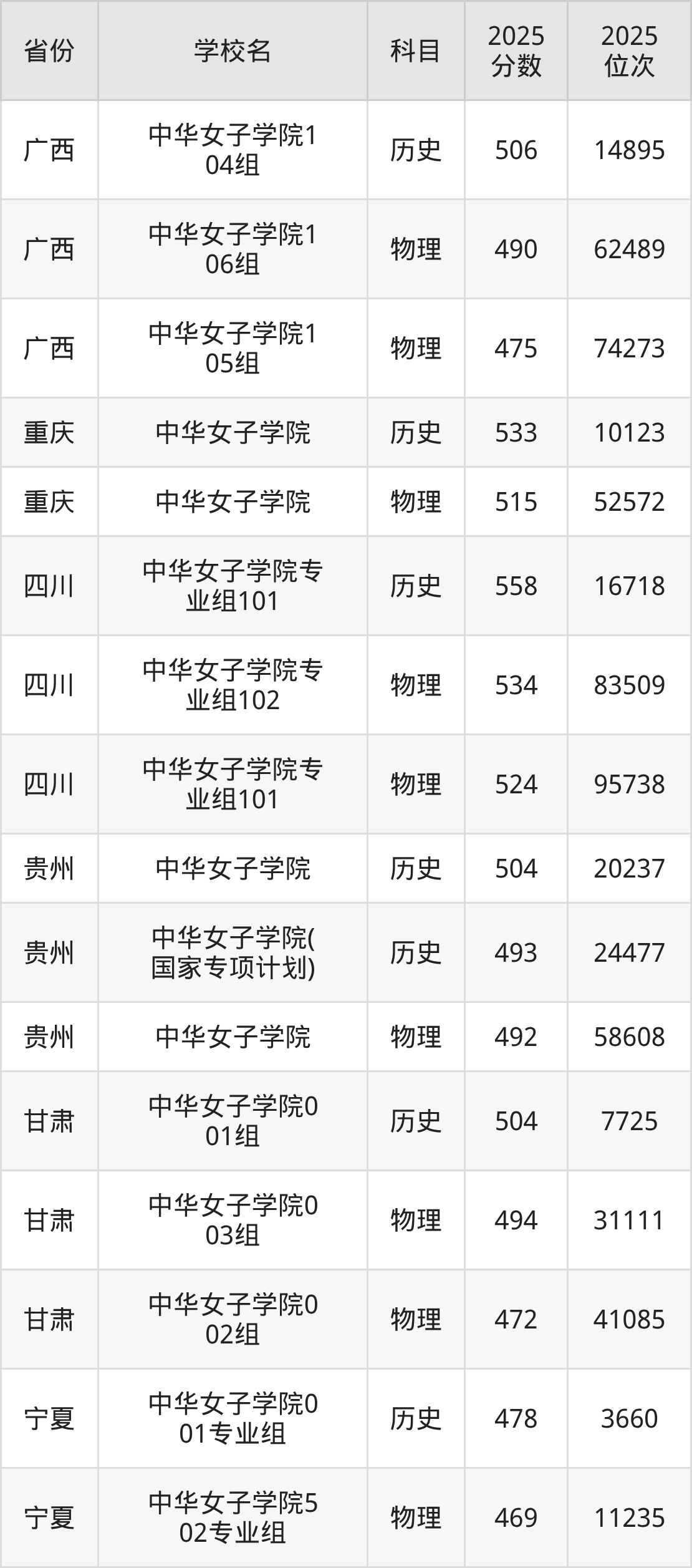 2025年中华女子学院最低分506分(35953名)。