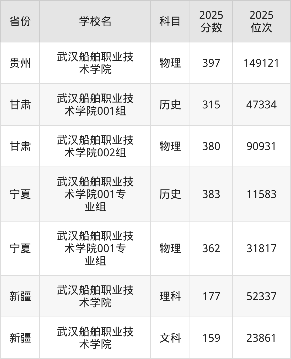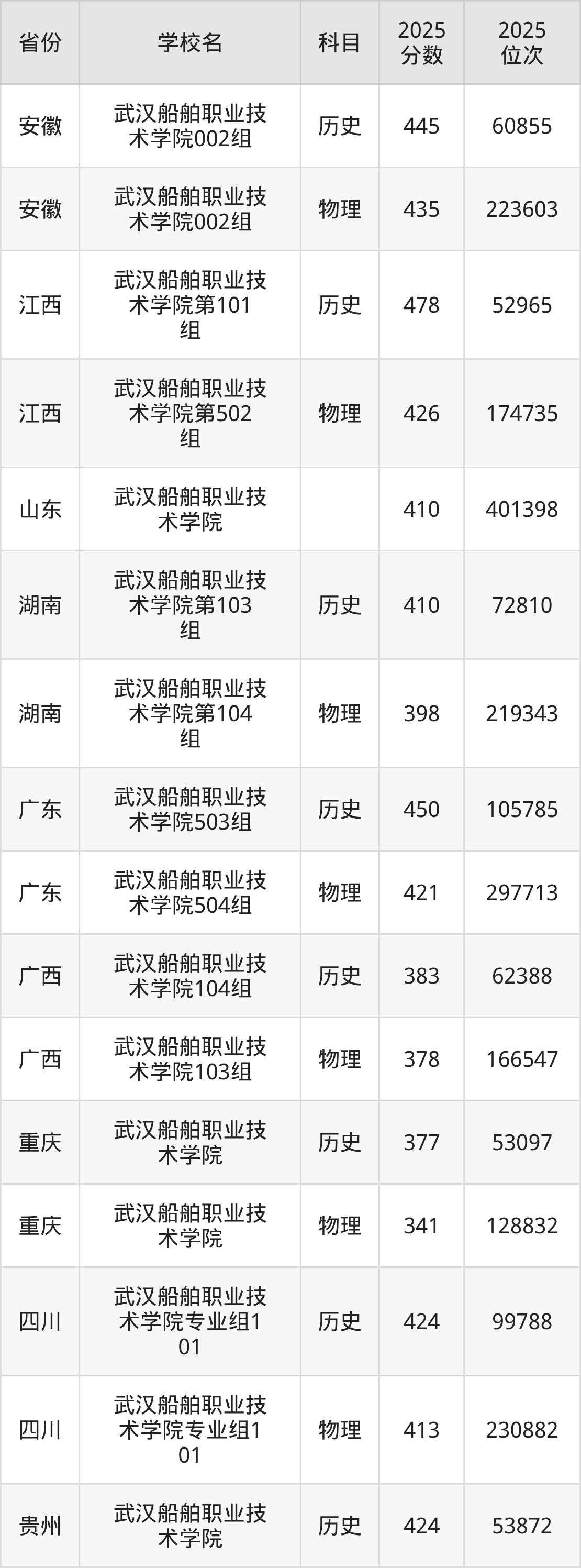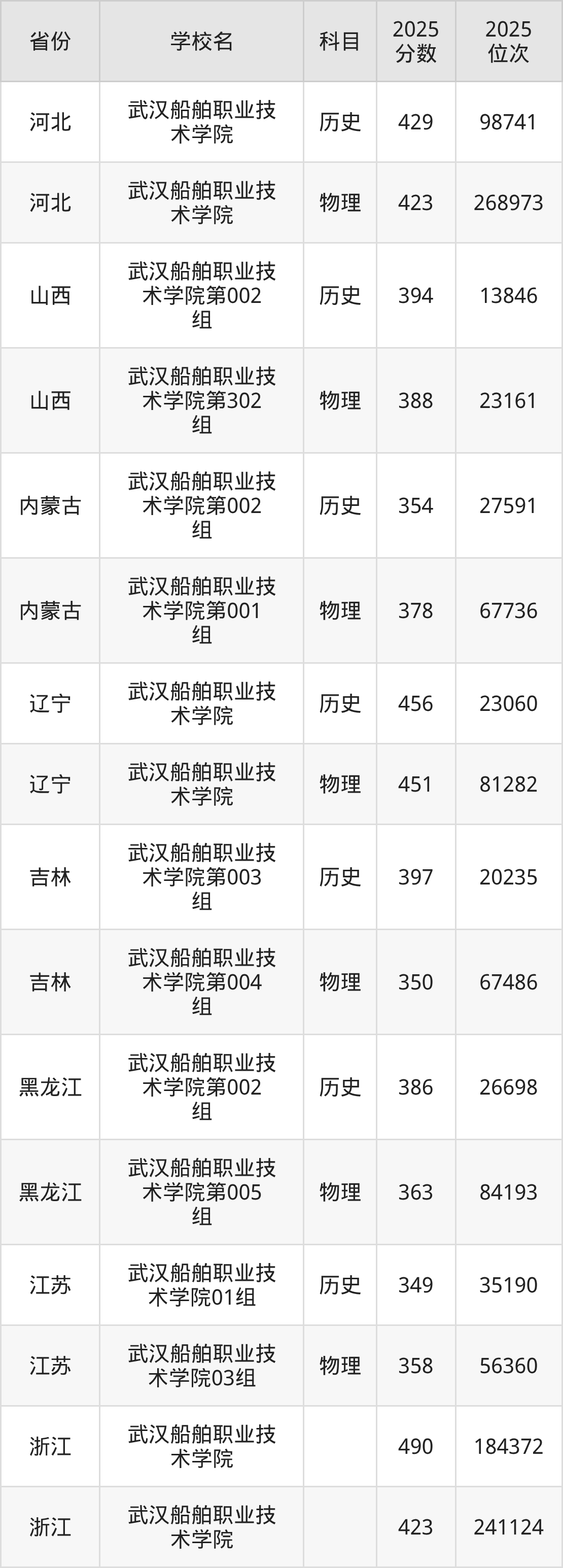 2025年武汉船舶职业技术学院历史类最低分381分(79260名)、物理类最低分370分(185608名)。