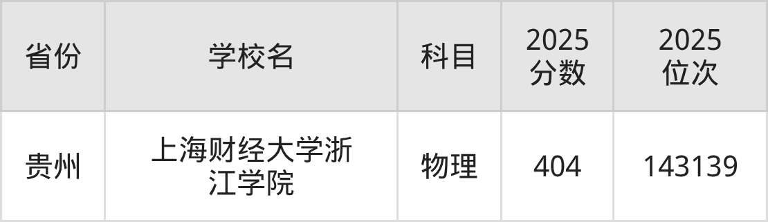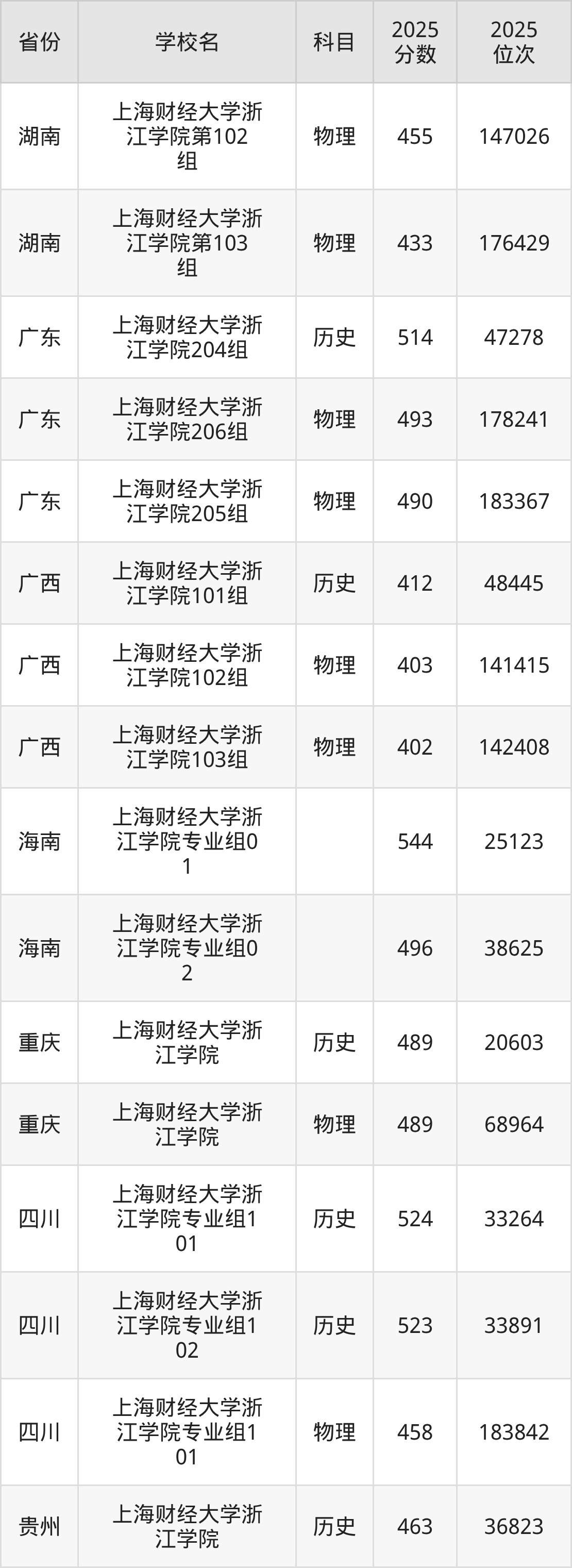2025年上海财经大学浙江学院在省外录取分数线范围整体位于402分到544分之间,录取分数线最低在广西物理(103组)、录取分数线最高在海南(专业组01)。
