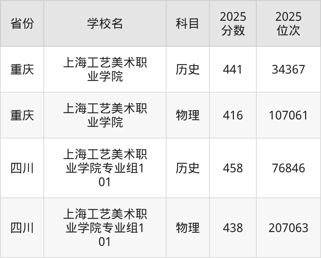 2026年上海工艺美术职业学院录取分数线预计在460分及以上,在各省录取最低分存在一定差异,如:2025年上海工艺美术职业学院在广东录取最低历史类491分、物理类470分,在重庆录取最低历史类441分、物理类416分,在四川录取最低历史类458分、物理类438分。