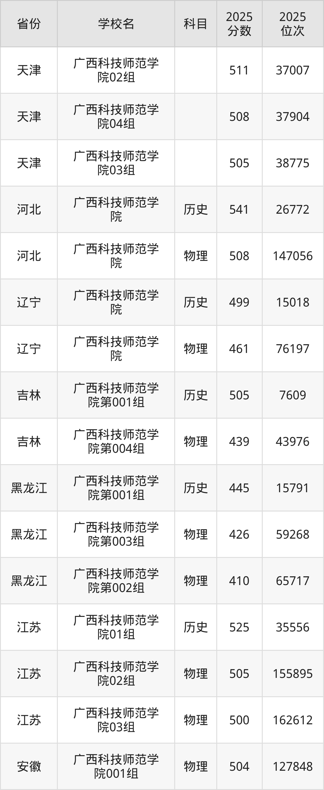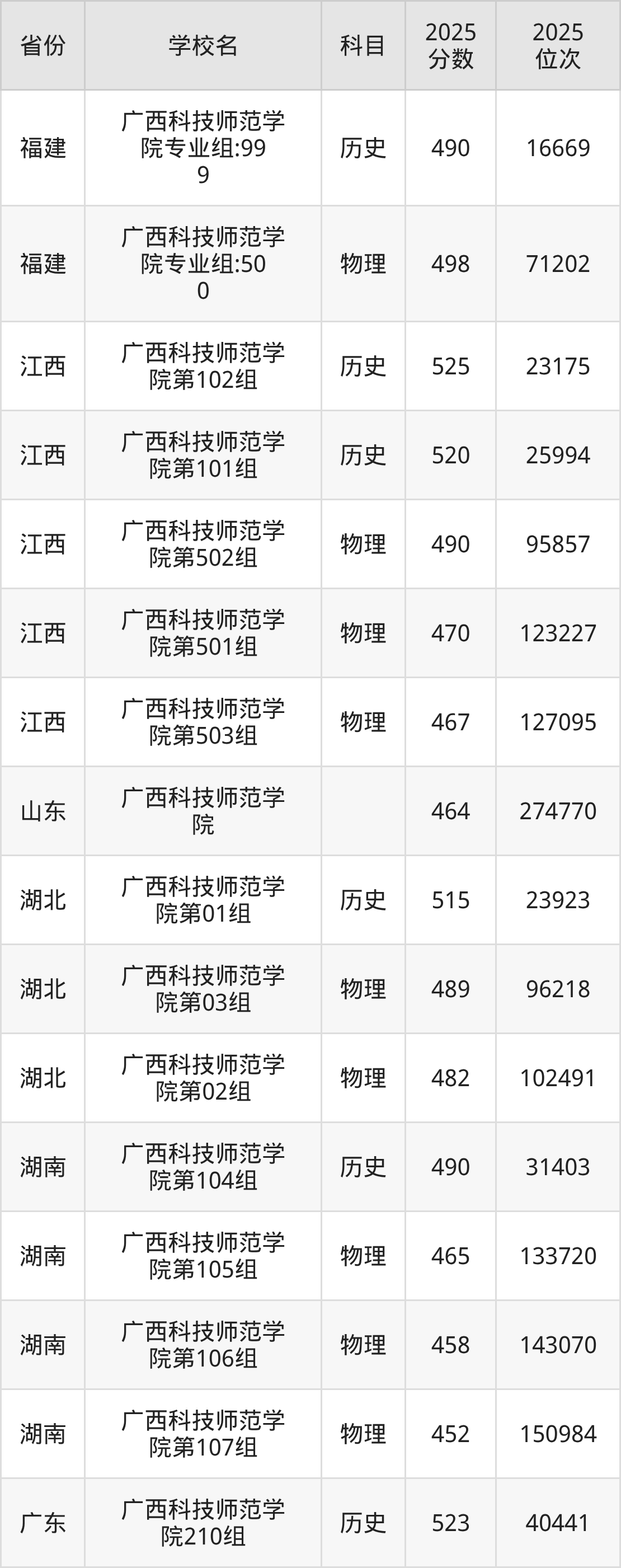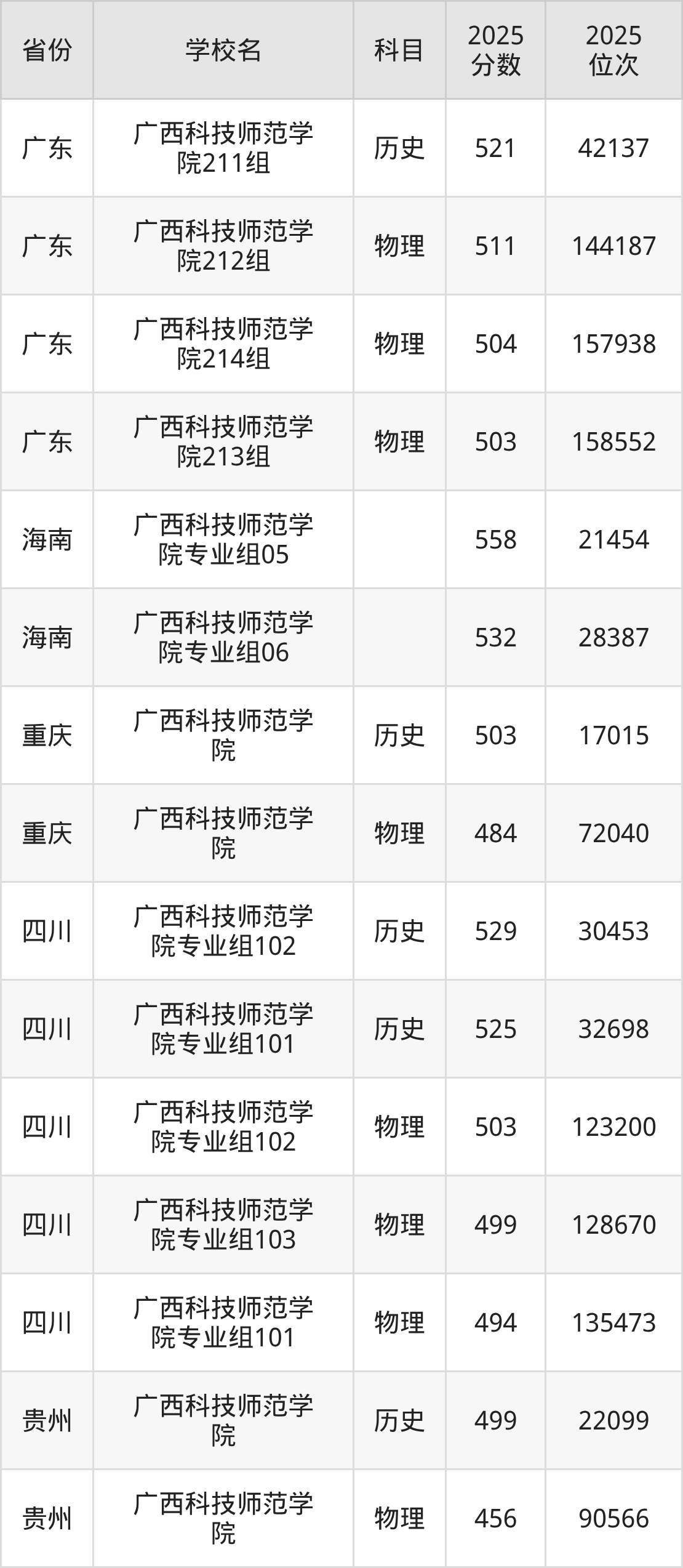 2025年广西科技师范学院历史类最低分443分(34965名)、物理类最低分420分(124397名)。