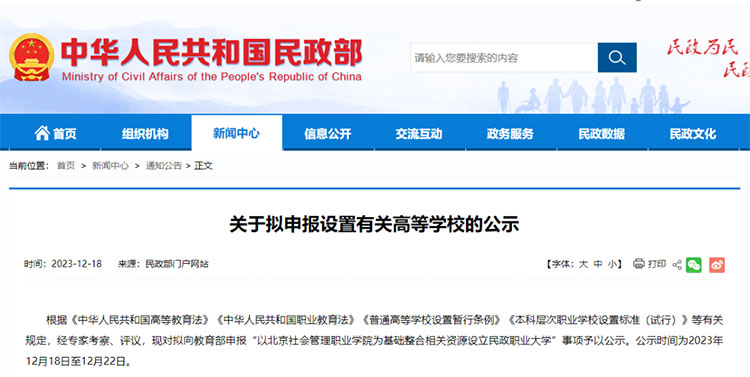 由此来看,待教育部公示结束后,发布同意设置民政职业大学的函后,北京社会管理职业学院将会升级为民政职业大学,成为民政部直属的唯一一所本科高校。