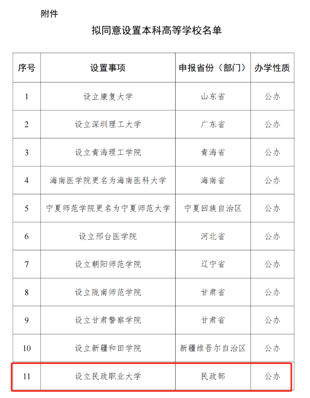 2024年5月15日,教育部发布《关于拟同意设置本科高等学校的公示》,拟同意设置本科高等学校名单中包含了民政职业大学。按照以往情况拟同意设置本科高等学校一般会在公示结束后,还需要教育部发布同意设置的函后才算正式变为本科院校。