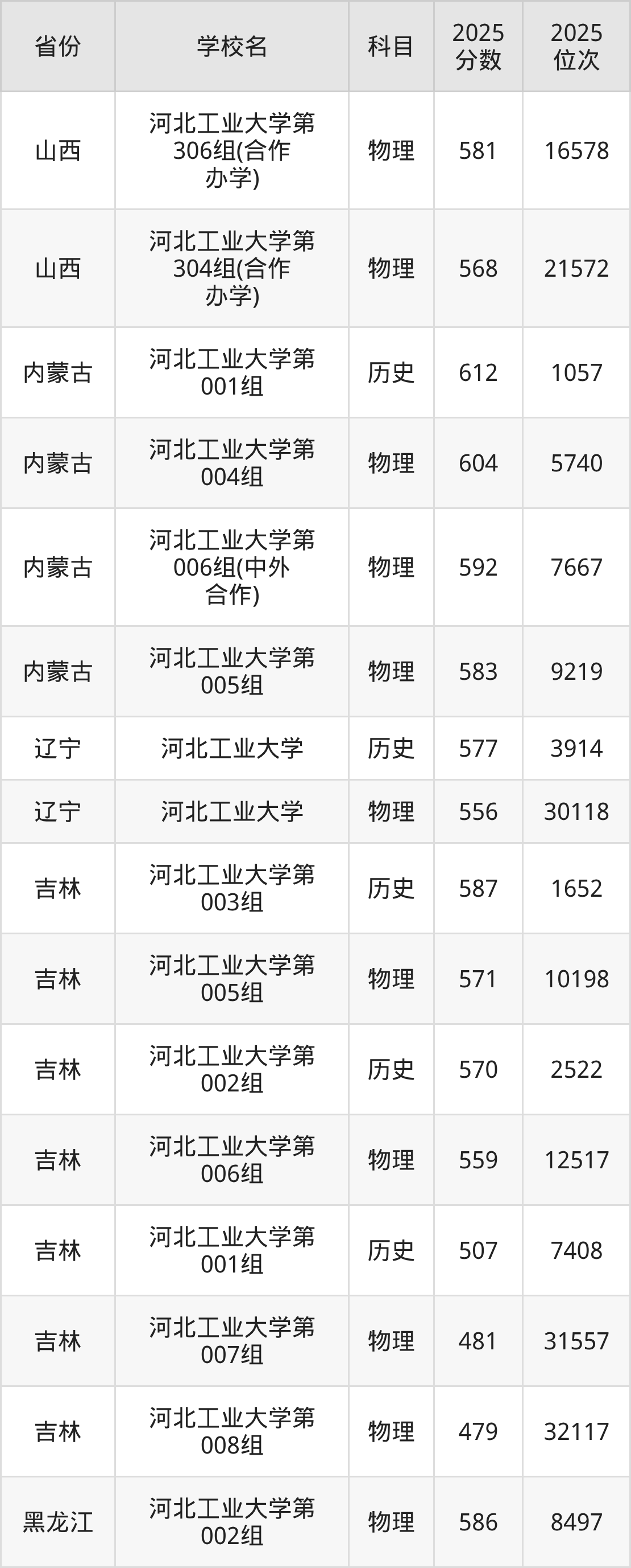 2025年河北工业大学在市外录取分数线范围整体位于479分到652分之间,录取分数线最低在吉林物理(第008组)、录取分数线最高在海南(专业组01)。