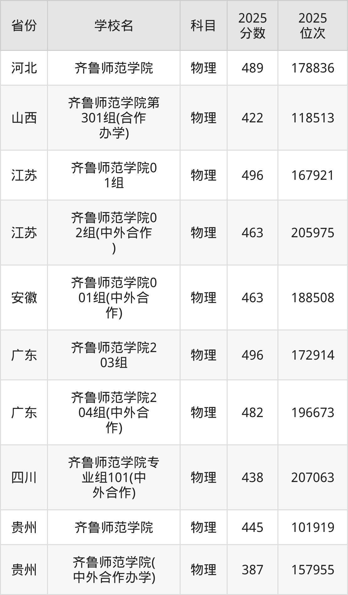 2025年齐鲁师范学院在省外录取分数线范围整体位于387分到496分之间,录取分数线最低在贵州物理、录取分数线最高在江苏物理(01组)。