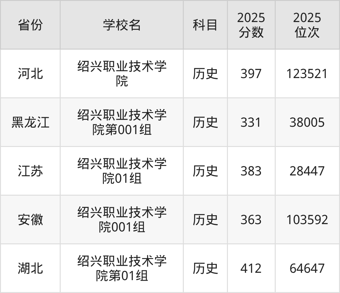 2026年绍兴职业技术学院录取分数线预计在400分及以上,在各省录取最低分存在一定差异,如:2025年绍兴职业技术学院在湖北录取最低历史类412分,在河北录取最低历史类397分,在黑龙江录取最低历史类331分。