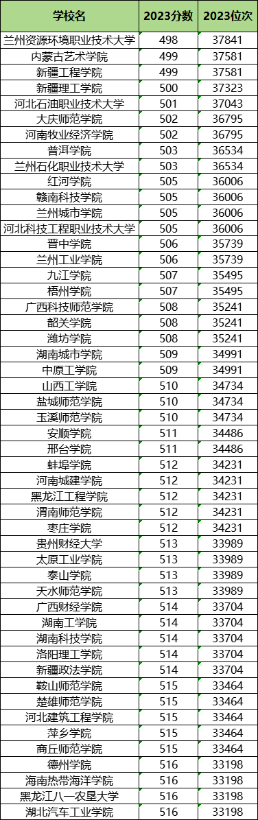 最好考、收分最低的公办二本大学有兰州资源环境职业技术大学、内蒙古艺术学院、新疆工程学院,这些学校2023历史类最低投档分为498分左右,比天津本科批次线高26分,考生可捡漏。