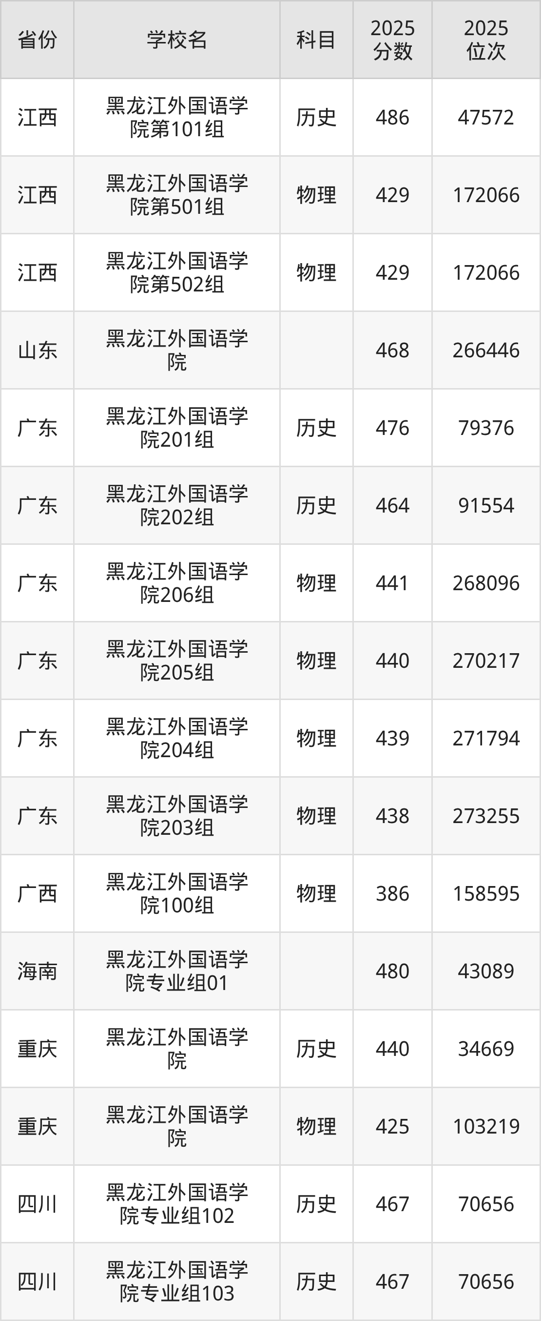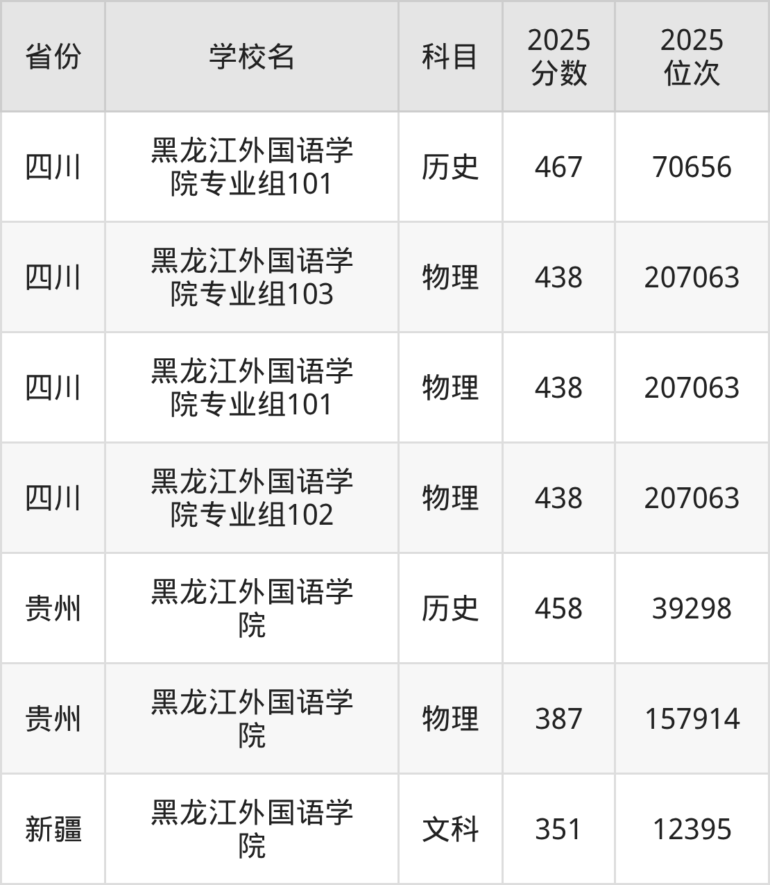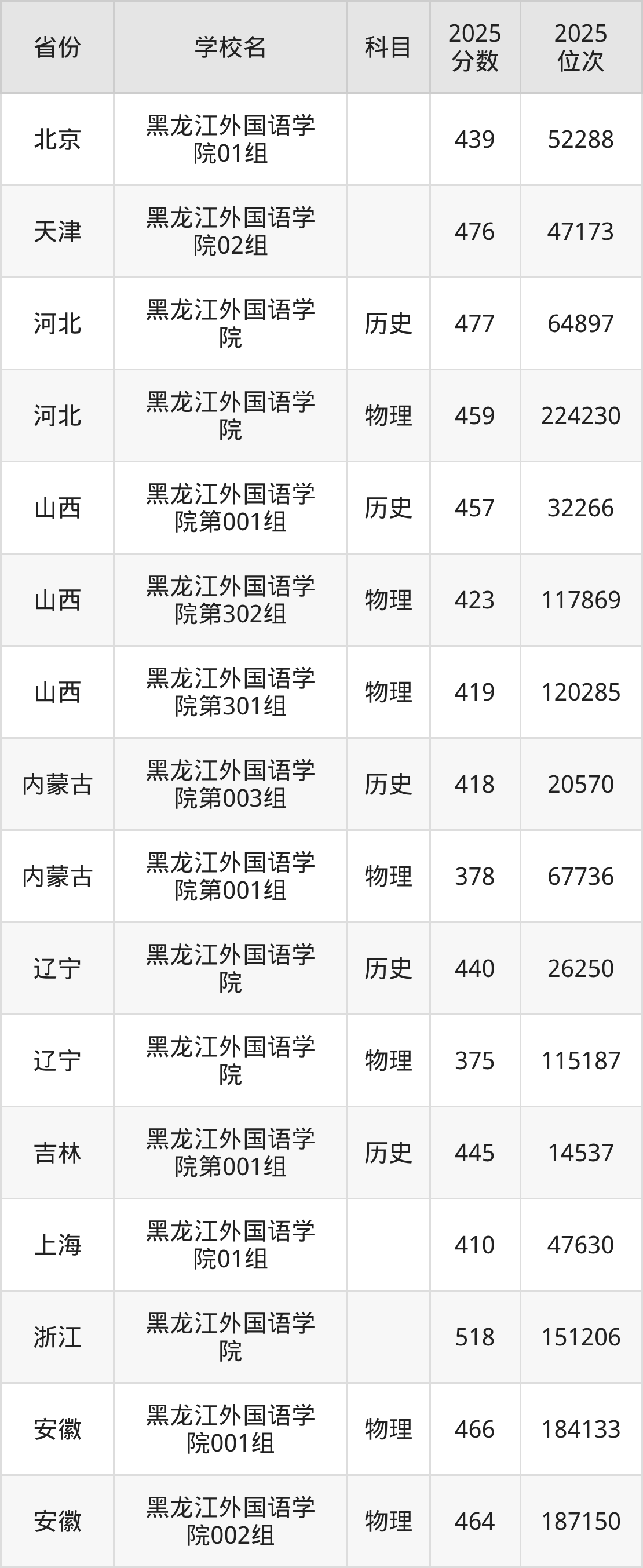2025年黑龙江外国语学院历史类最低分405分(22977名)、物理类最低分360分(85313名)。