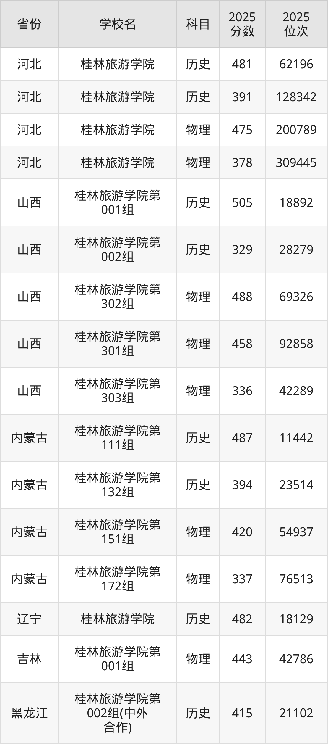 2025年桂林旅游学院在壮族自治区内分历史物理科目类录取,其中历史类最低分是309分、对应位次是98830名;物理类最低分是332分,对应位次是208472名。