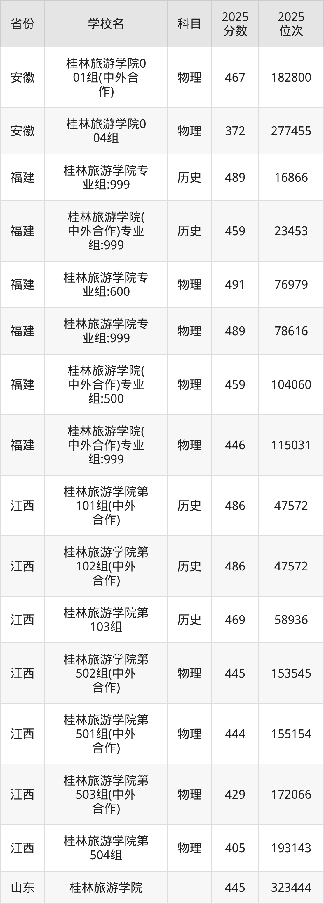 2025年桂林旅游学院历史类最低分309分(98830名)、物理类最低分332分(208472名)。