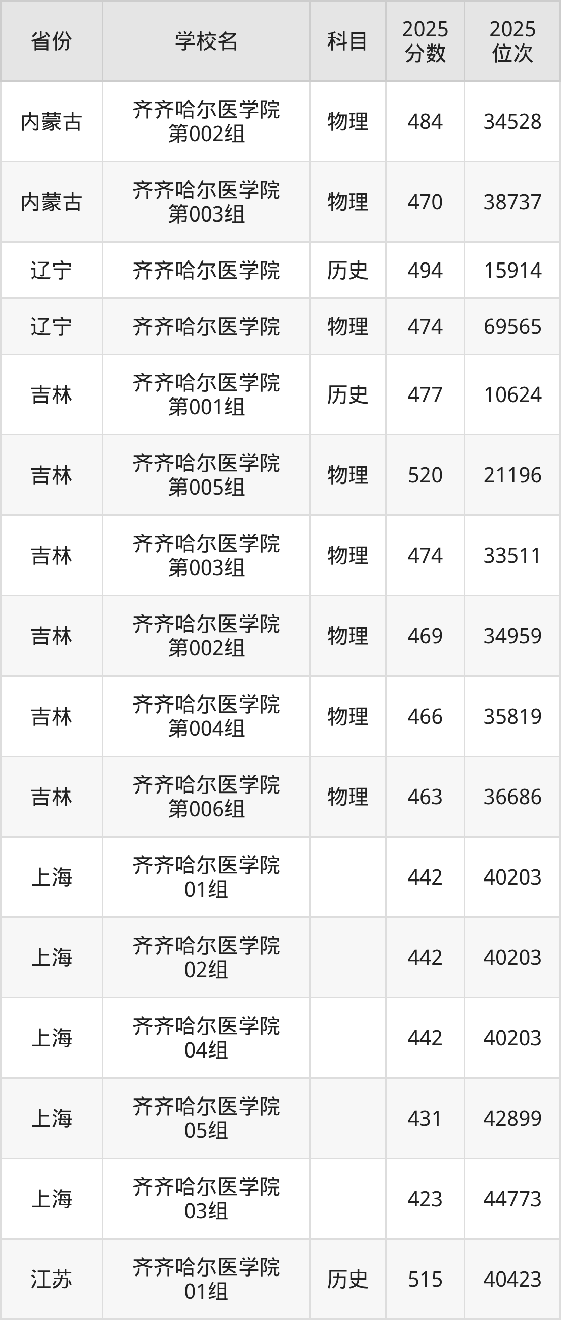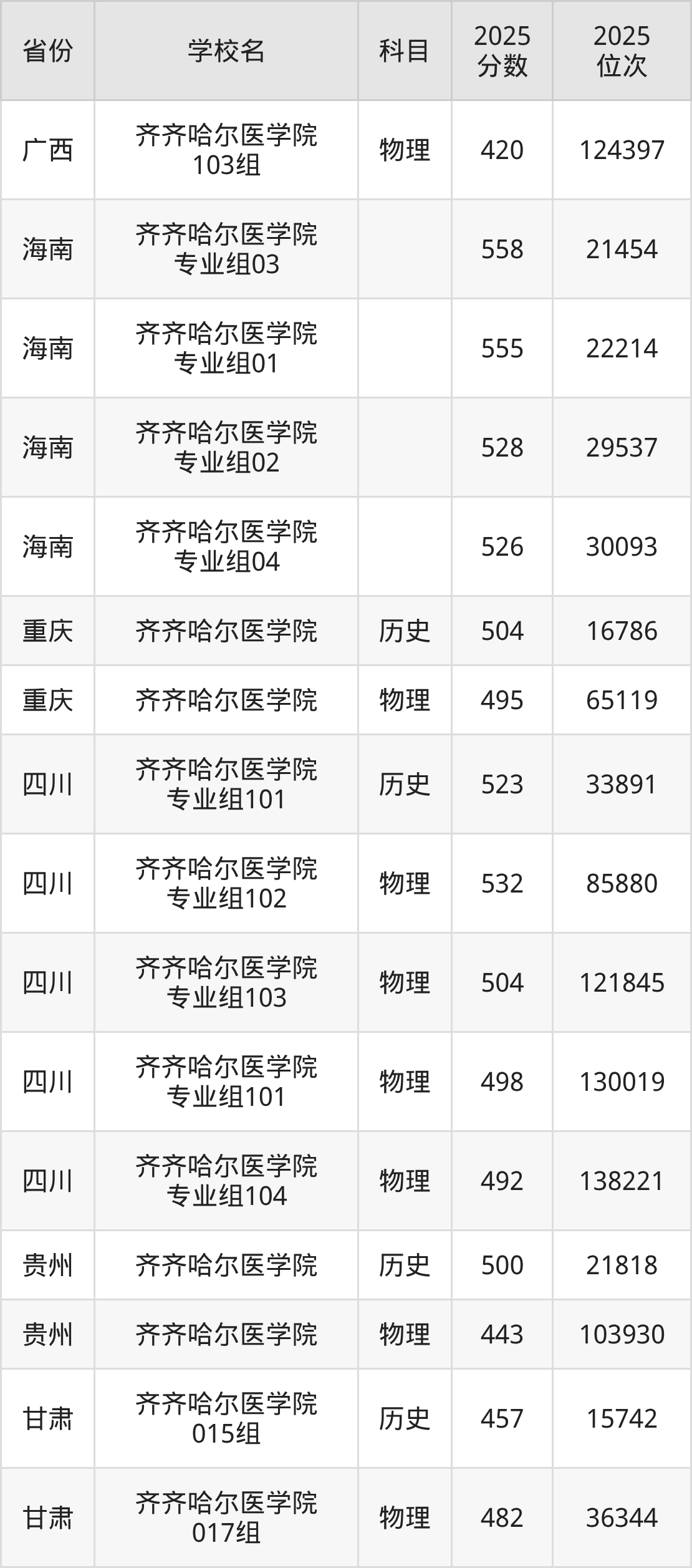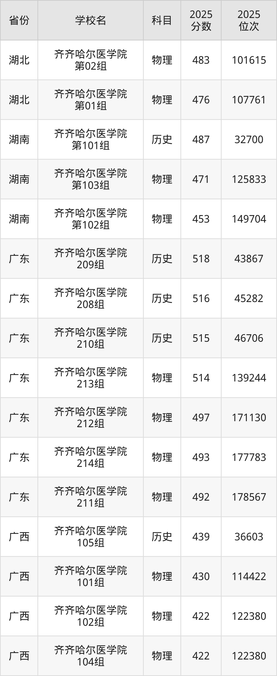 2026年齐齐哈尔医学院录取分数线预计在480分及以上,在各省录取最低分存在一定差异,如:2025年齐齐哈尔医学院在广西录取最低历史类439分、物理类420分,在贵州录取最低历史类500分、物理类443分,在新疆录取最低理科362分。