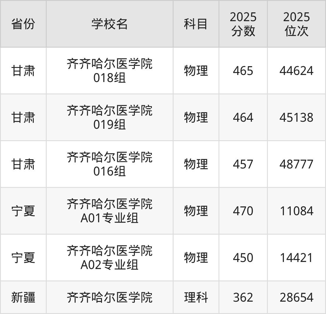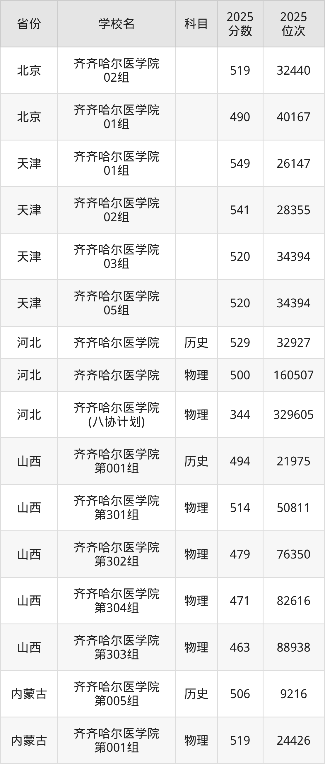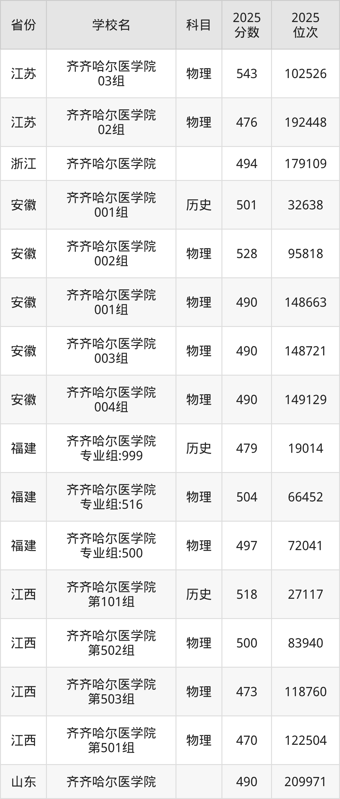 2026年齐齐哈尔医学院录取分数线预计在480分及以上,在各省录取最低分存在一定差异,如:2025年齐齐哈尔医学院在广西录取最低历史类439分、物理类420分,在贵州录取最低历史类500分、物理类443分,在新疆录取最低理科362分。