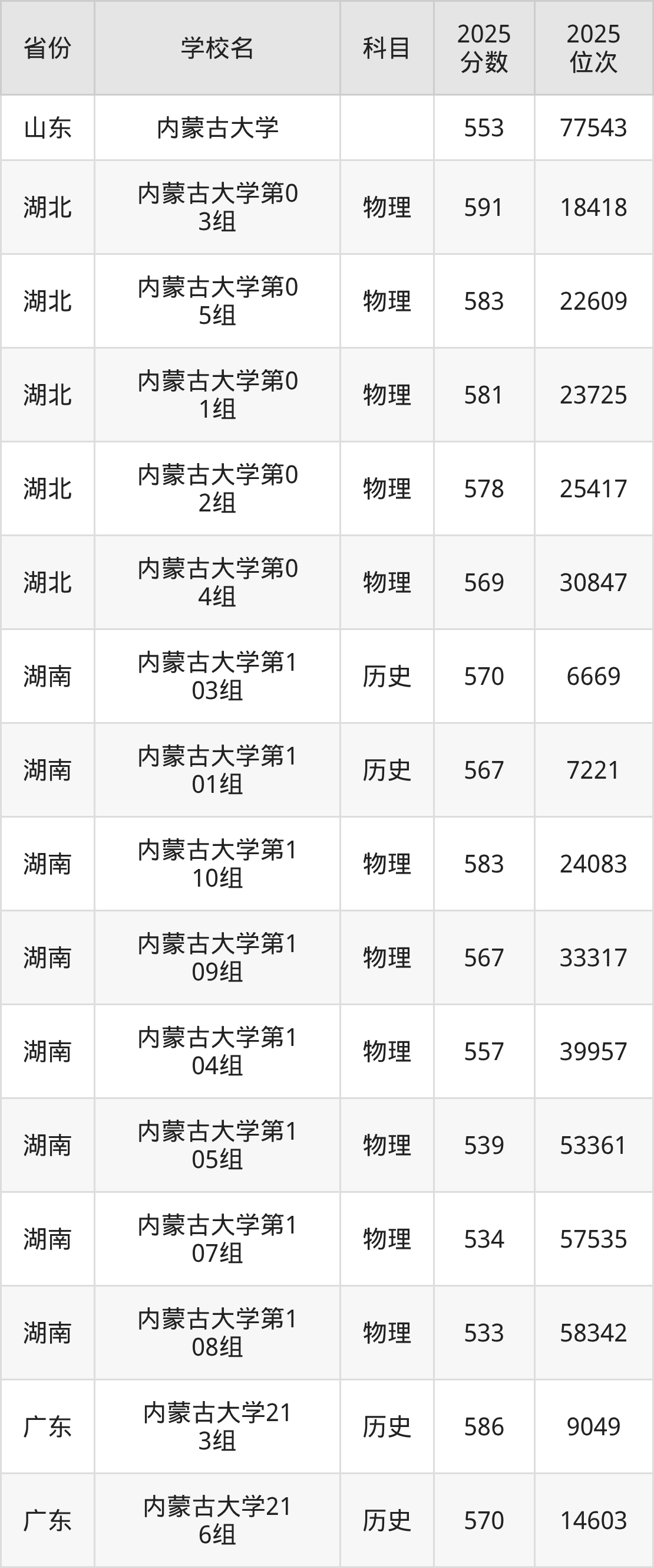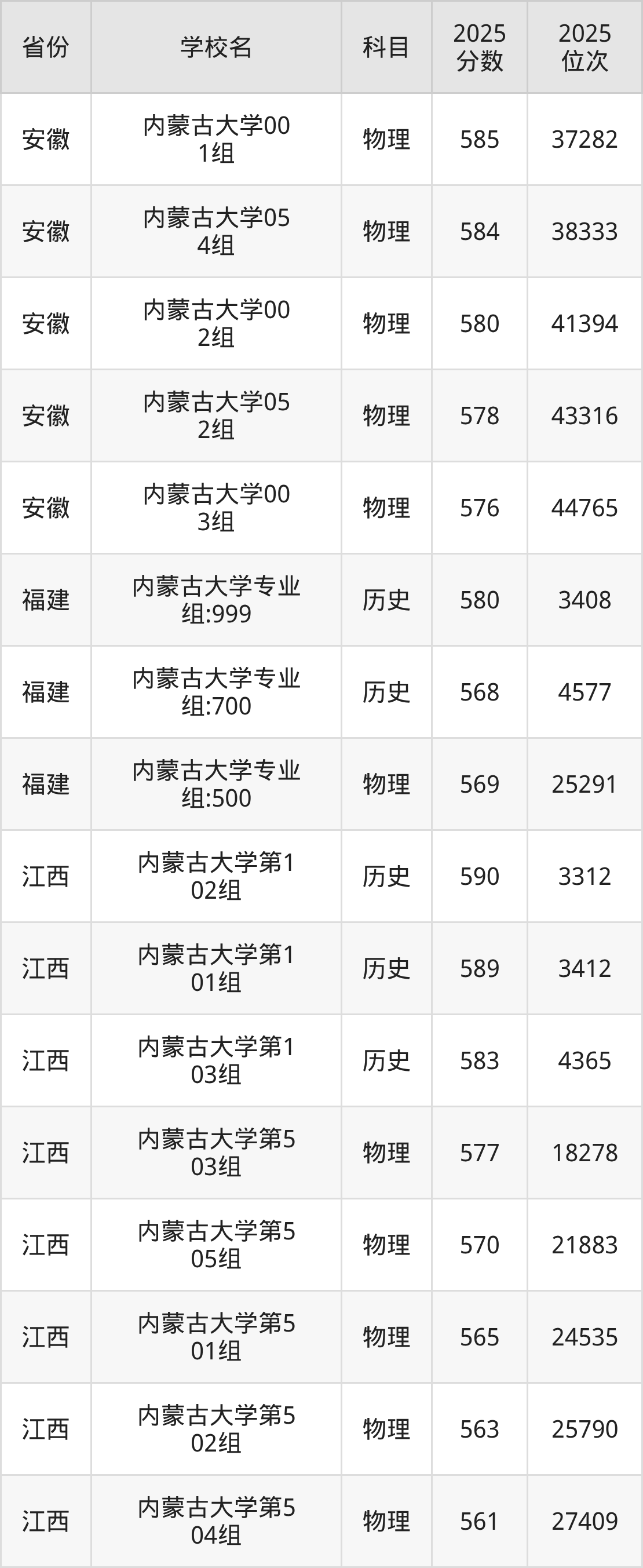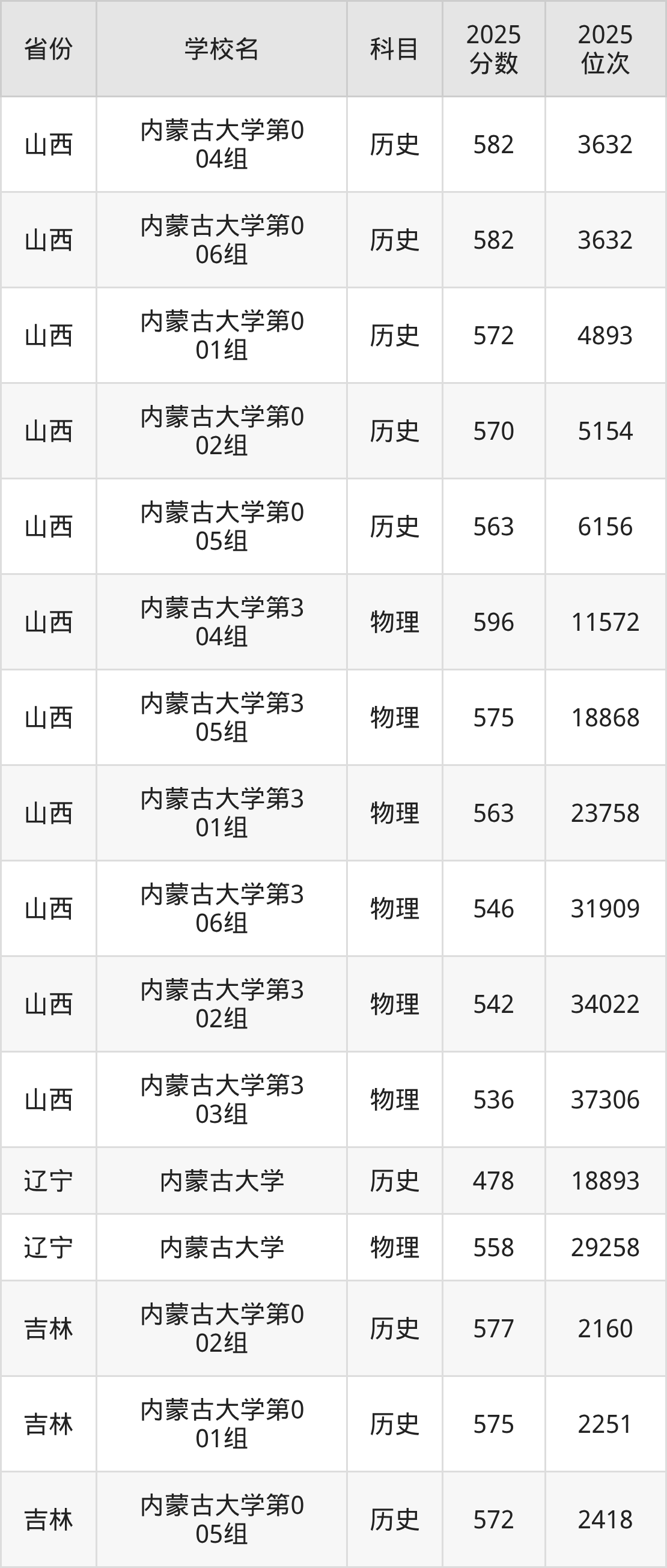 2025年内蒙古大学在自治区内分历史物理科目类录取,其中历史类最低分是555分、对应位次是4441名;物理类最低分是534分,对应位次是20296名。