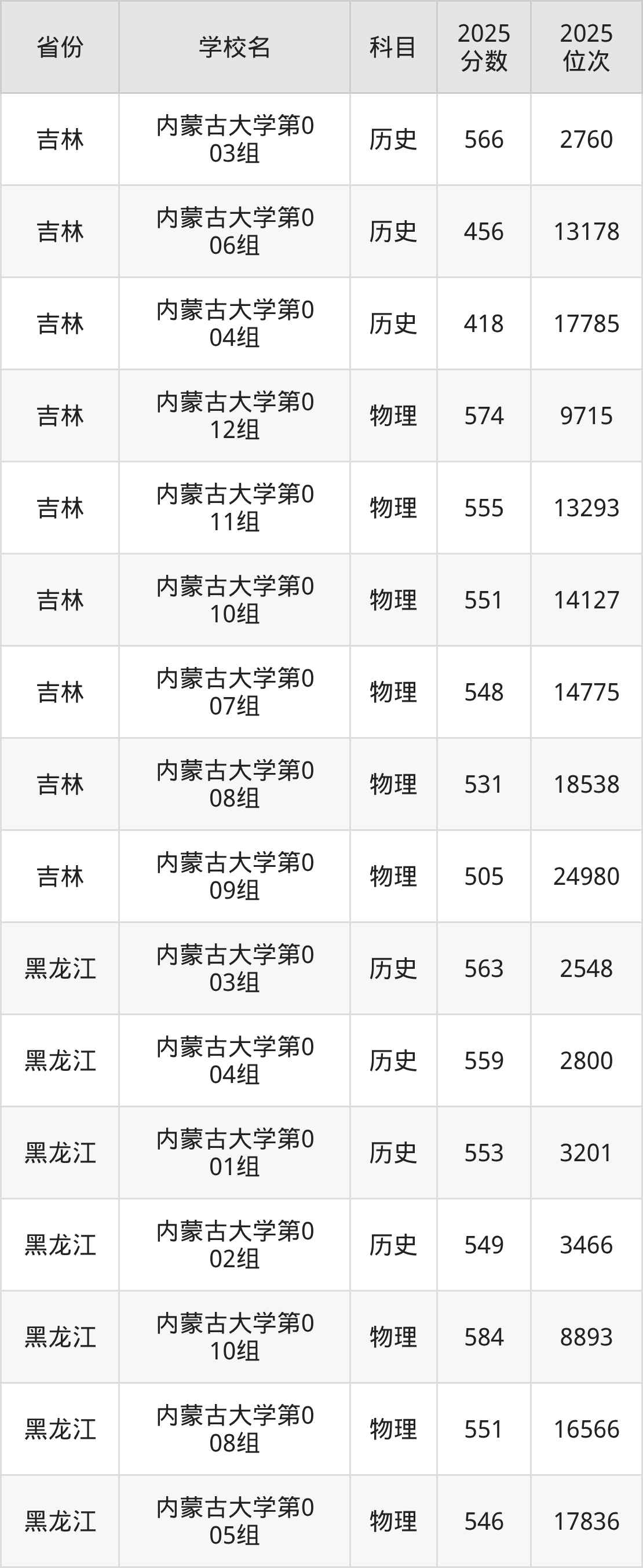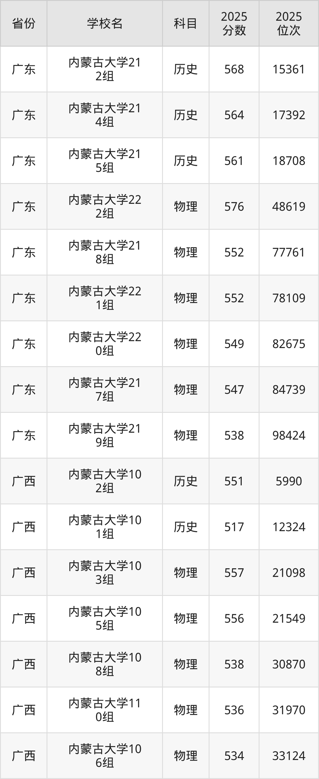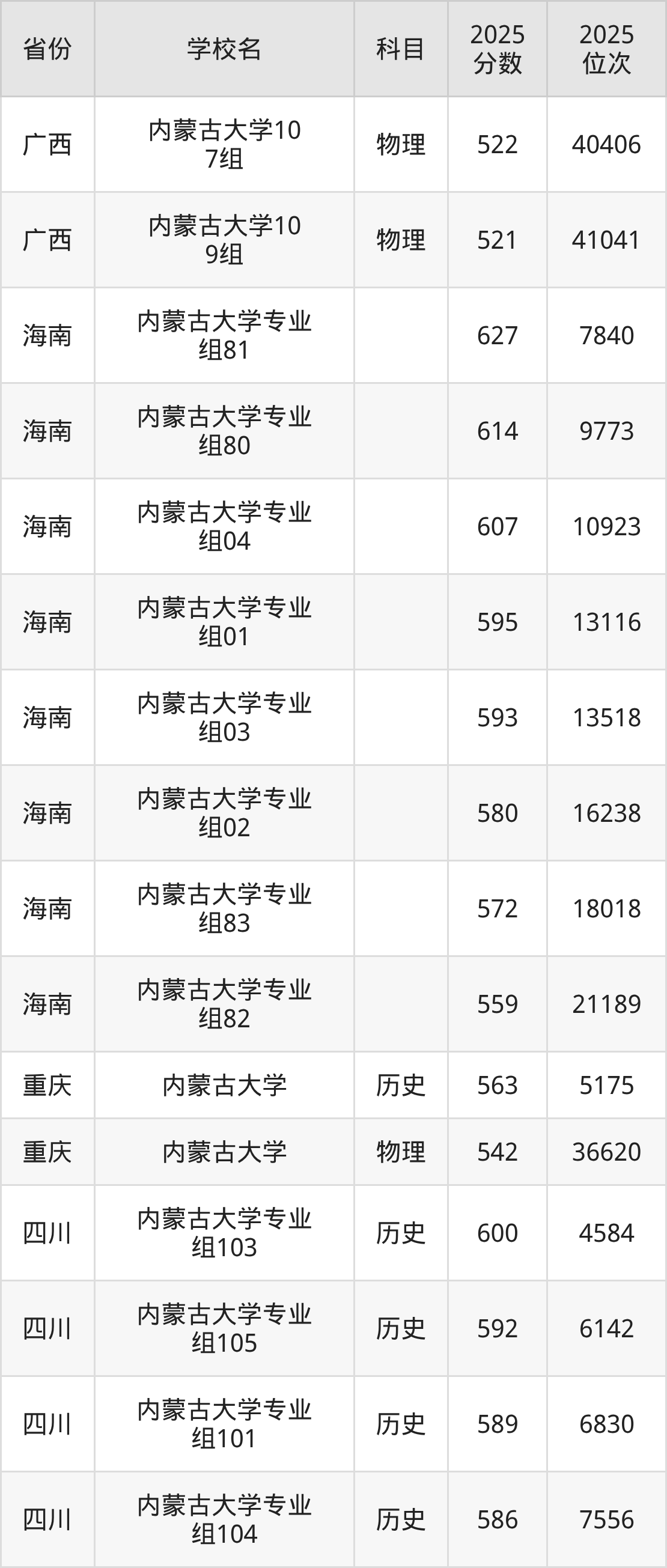 2025年内蒙古大学在自治区内分历史物理科目类录取,其中历史类最低分是555分、对应位次是4441名;物理类最低分是534分,对应位次是20296名。