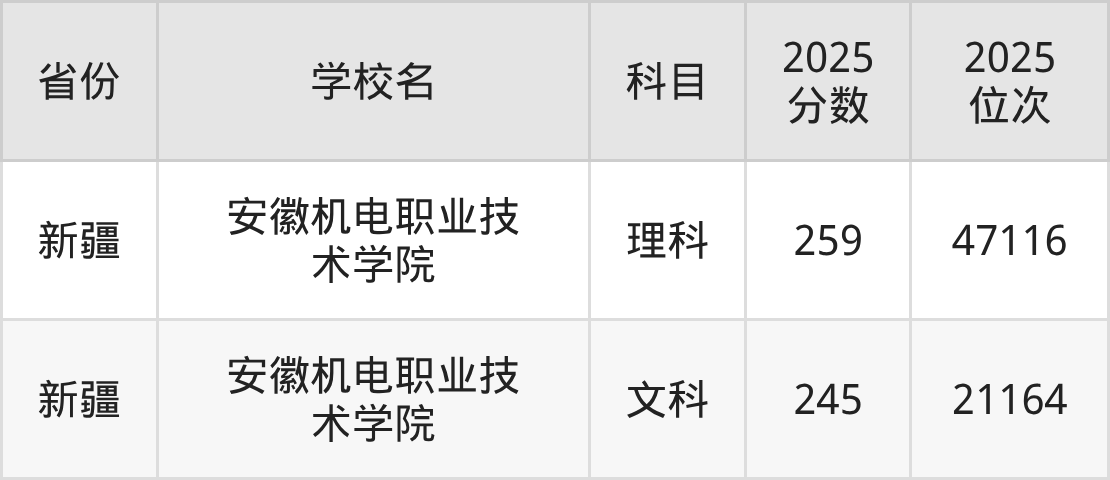 2025年安徽机电职业技术学院在省外录取分数线范围整体位于245分到259分之间,录取分数线最低在新疆文科、录取分数线最高在新疆理科。