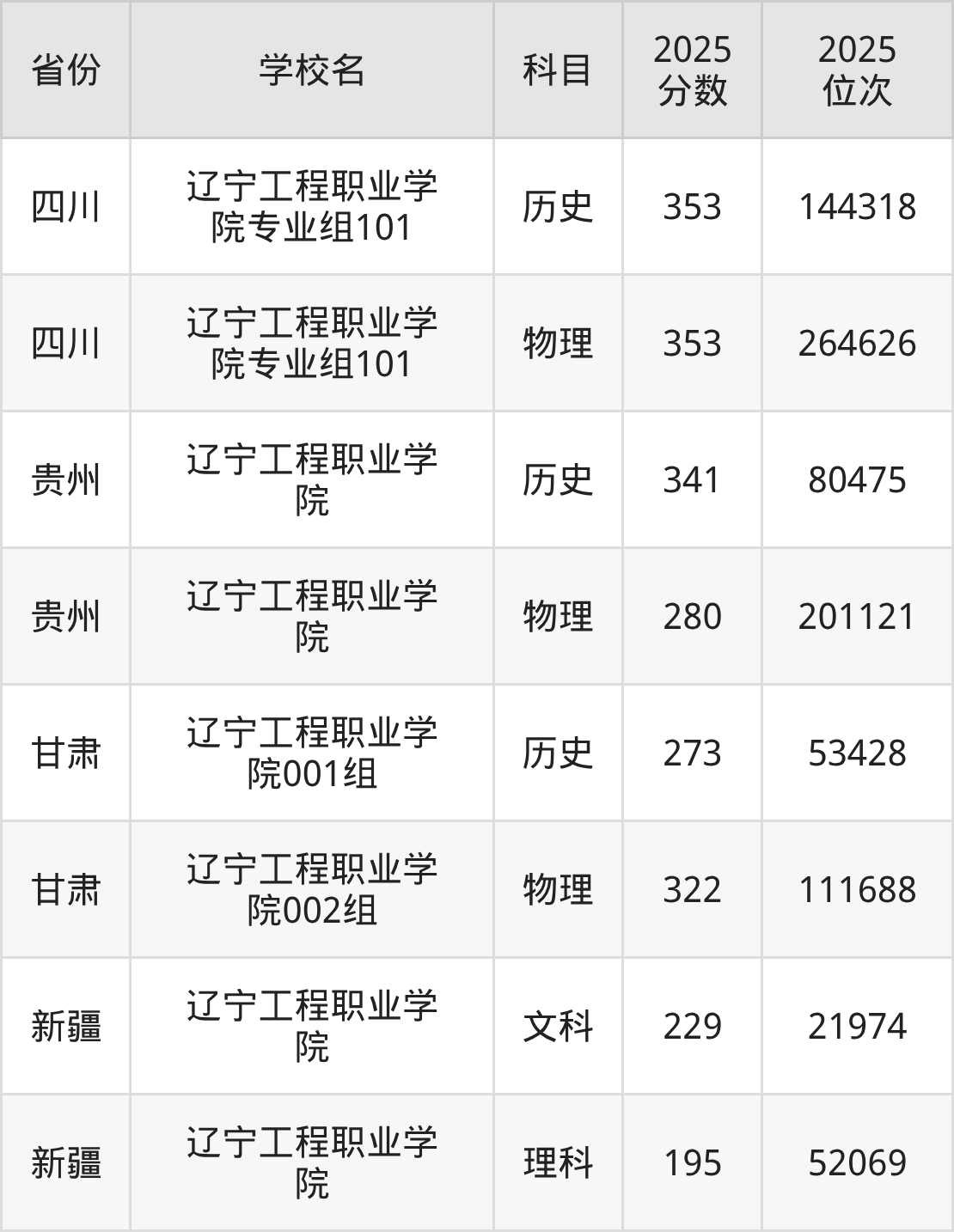 2025年辽宁工程职业学院在省内分历史物理科目类录取,其中历史类最低分是310分、对应位次是49450名;物理类最低分是286分,对应位次是137247名。