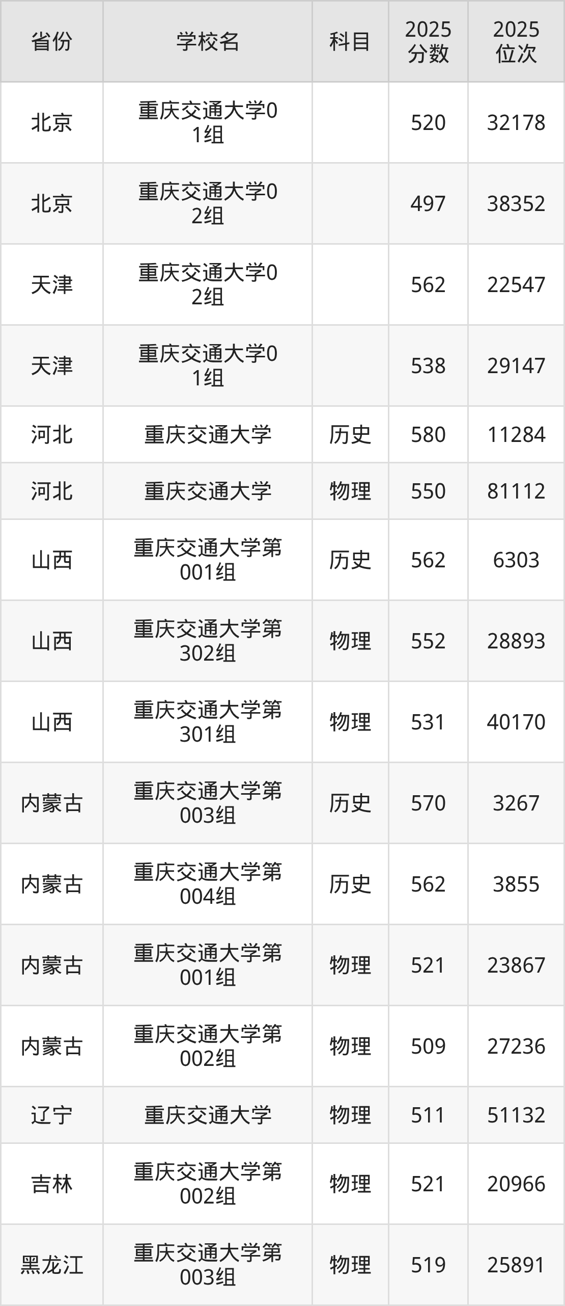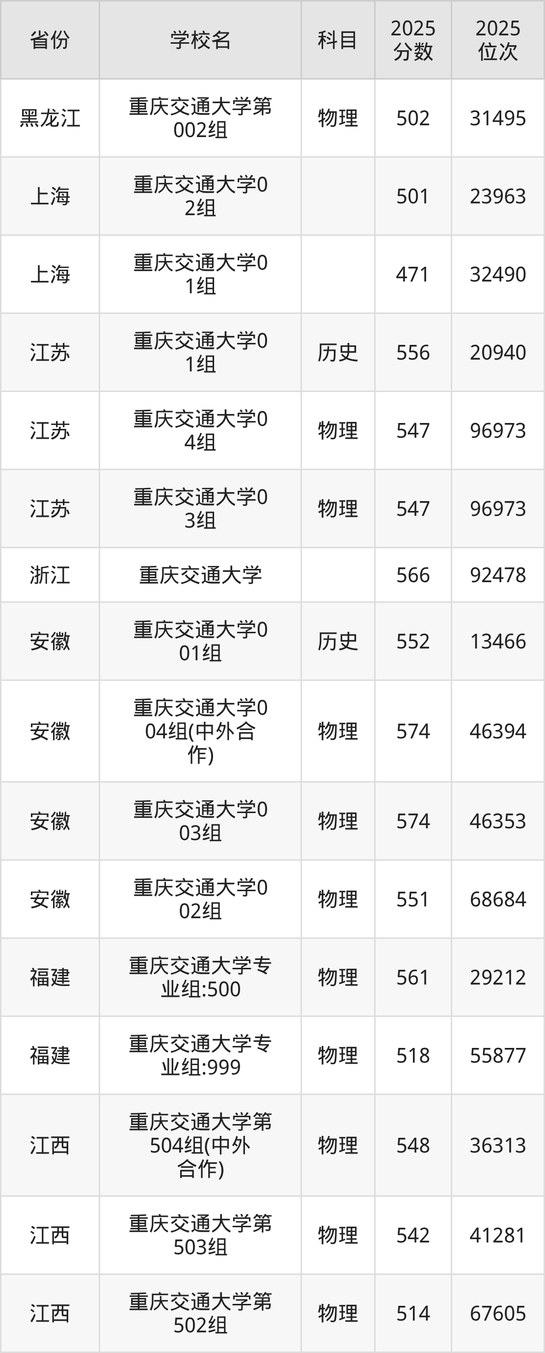 2025年重庆交通大学历史类最低分523分(12316名)、物理类最低分509分(56392名)。