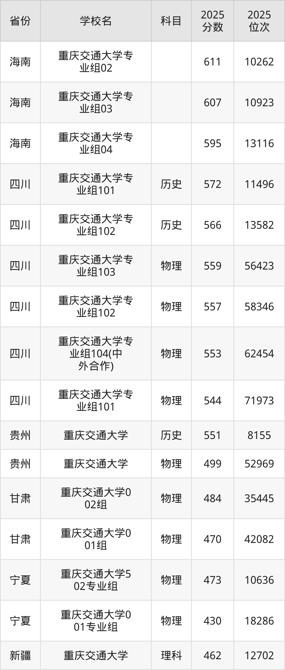 2025年重庆交通大学在市外录取分数线范围整体位于422分到611分之间,录取分数线最低在广西物理(102组)、录取分数线最高在海南(专业组02)。