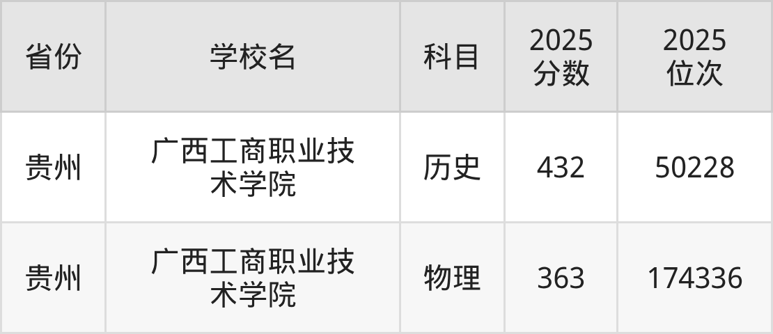 2025年广西工商职业技术学院在壮族自治区内分历史物理科目类录取,其中历史类最低分是376分、对应位次是66049名;物理类最低分是354分,对应位次是189354名。