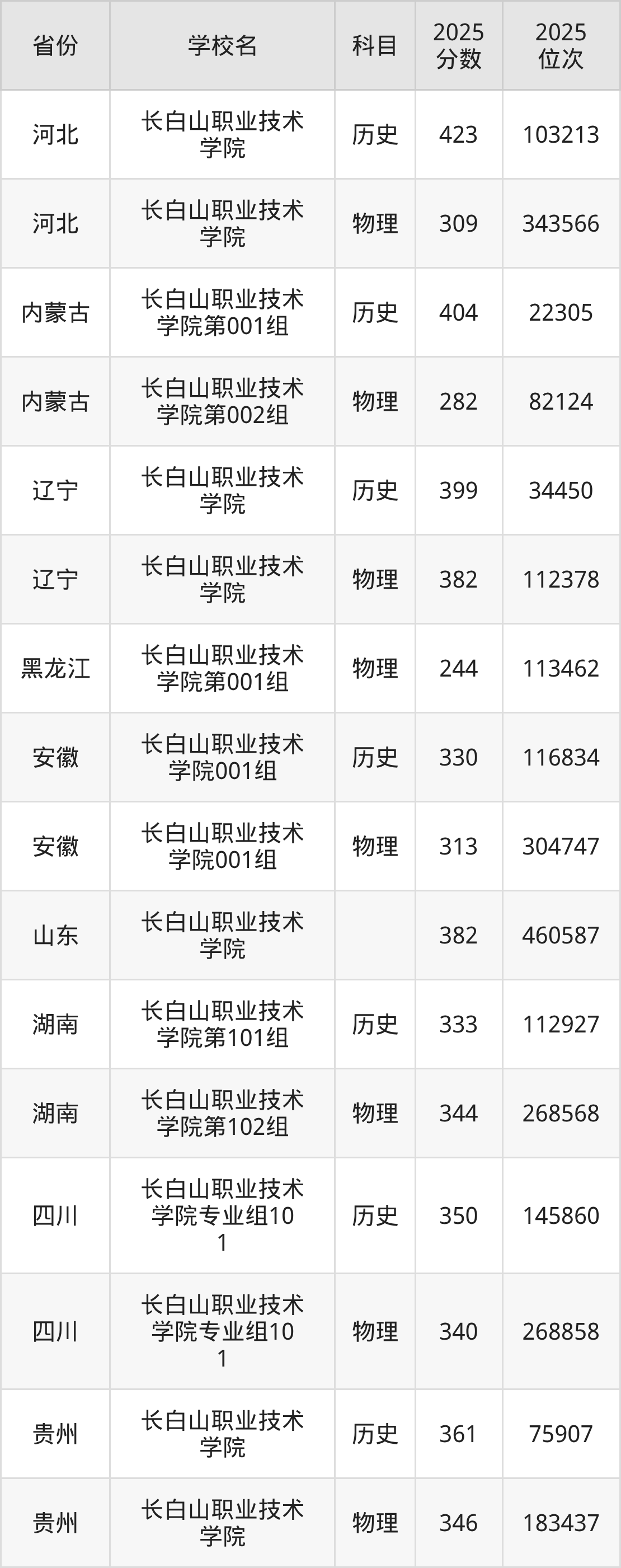 2025年长白山职业技术学院历史类最低分332分(25978名)、物理类最低分224分(78627名)。