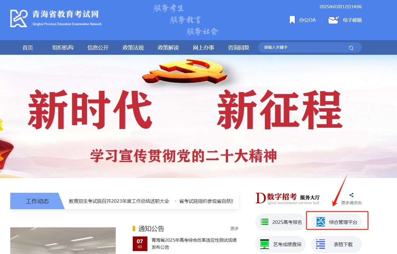 考生点击上方网址,进入青海教育考试网官网,在首页右方找到“数字招考服务大厅”栏目,然后点击“综合管理平台”,如图: