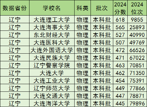 下面是2024年大连市公办本科院校分数线排名物理类一览表: