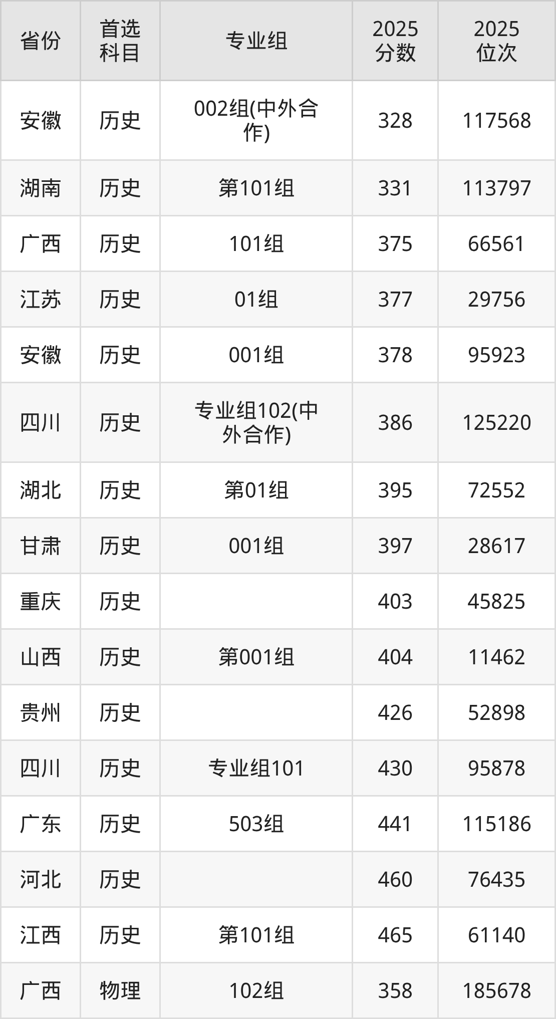 历史类最低分对应地区为安徽(002组(中外合作)),录取位次为117568,超专科线128分;最高分对应地区为江西(第101组),录取位次为61140,超专科线175分。
