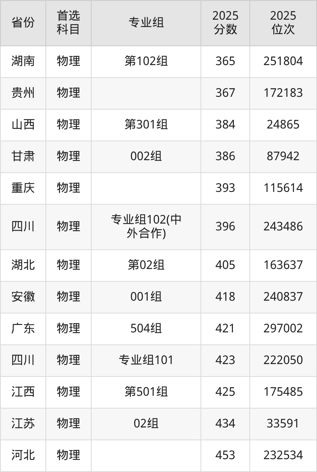 物理类:专业组101423分、222050名,专业组102(中外合作)396分、243486名;