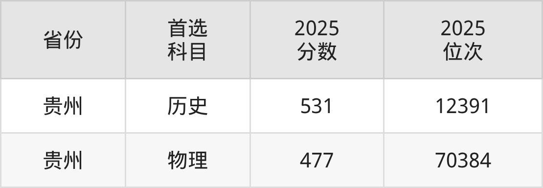 2025年贵州财经大学(地方专项计划)在新高考3+1+2地区的录取分数线为:历史类531分、物理类477分。