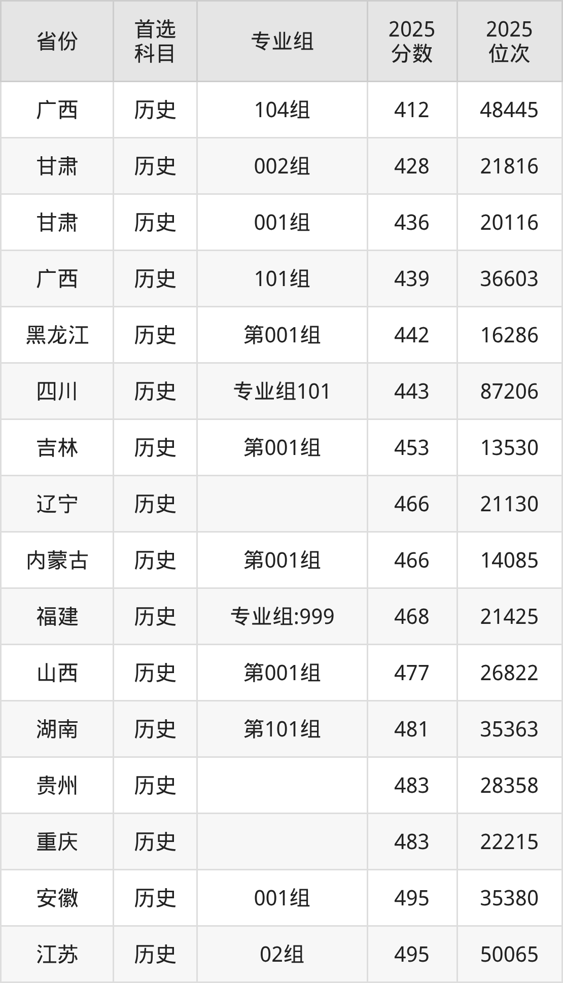 历史类:专业组101443分、87206名,专业组101534分、27829名,专业组102518分、36792名,专业组103512分、40388名,专业组104505分、44731名;