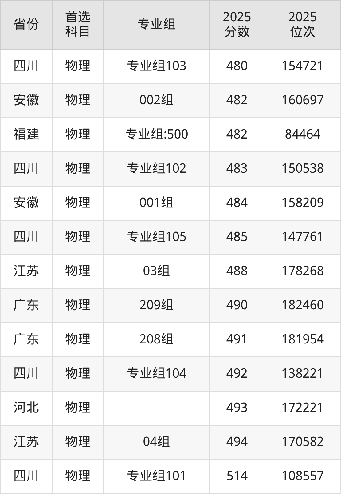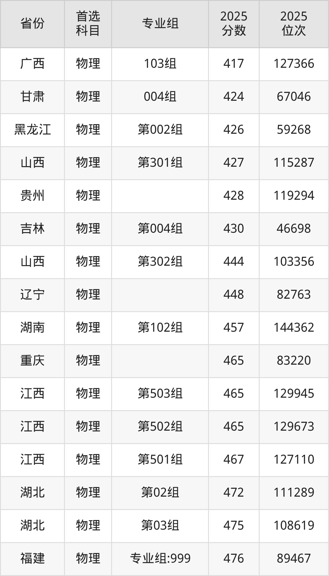 物理类:专业组101381分、252279名,专业组101514分、108557名,专业组102483分、150538名,专业组103480分、154721名,专业组104492分、138221名,专业组105485分、147761名;