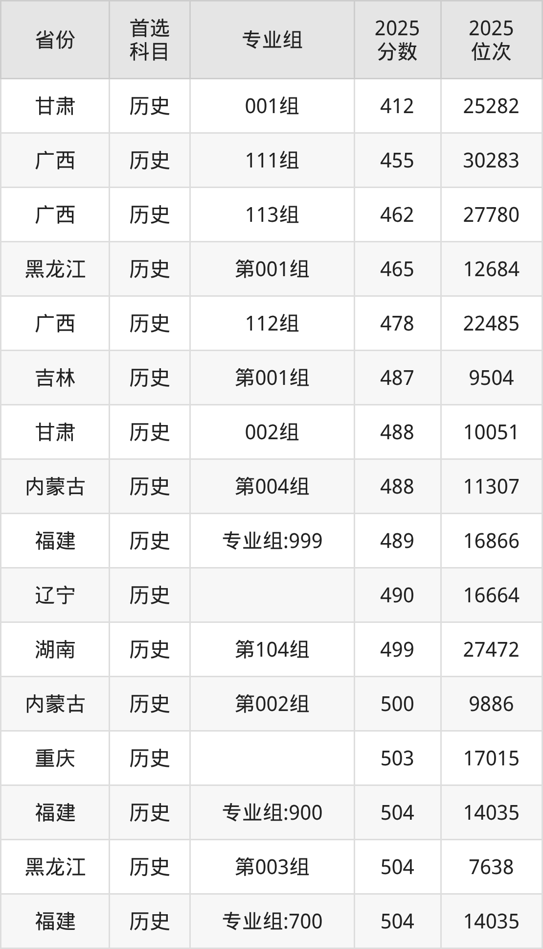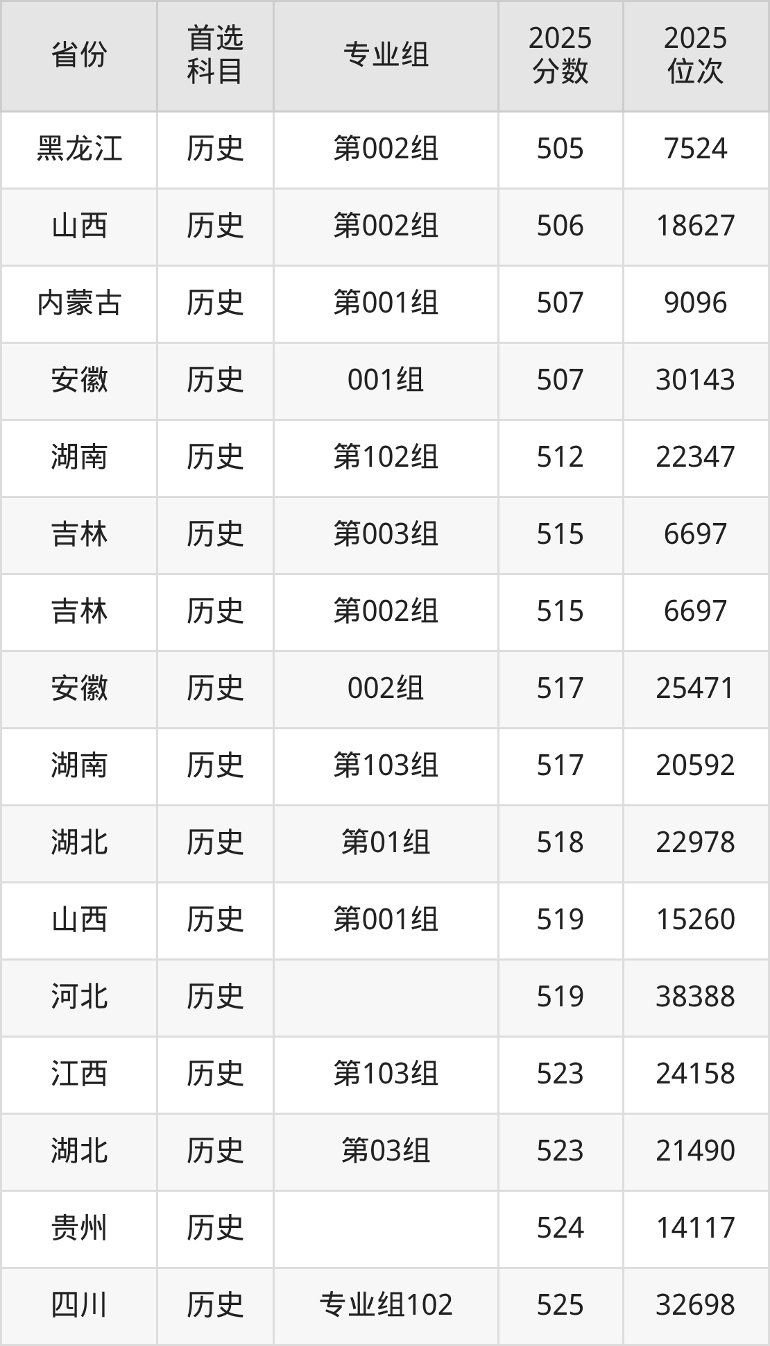 历史类最低分对应地区为甘肃(001组),录取位次为25282;最高分对应地区为四川(专业组101),录取位次为27268,超本科B68分。