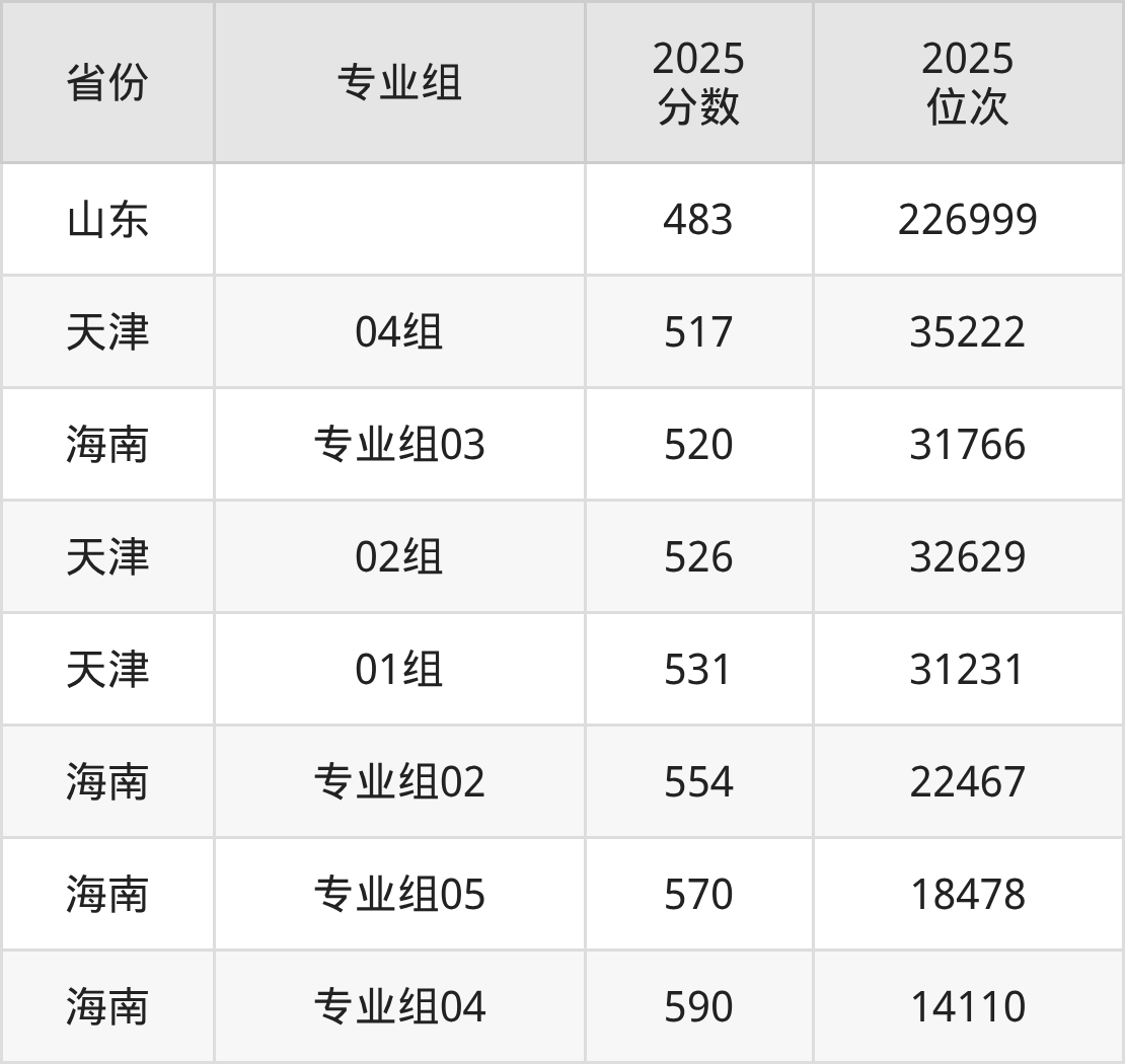 最低分对应地区为山东,录取位次为226999,超一段线69分;最高分对应地区为海南(专业组04),录取位次为14110。