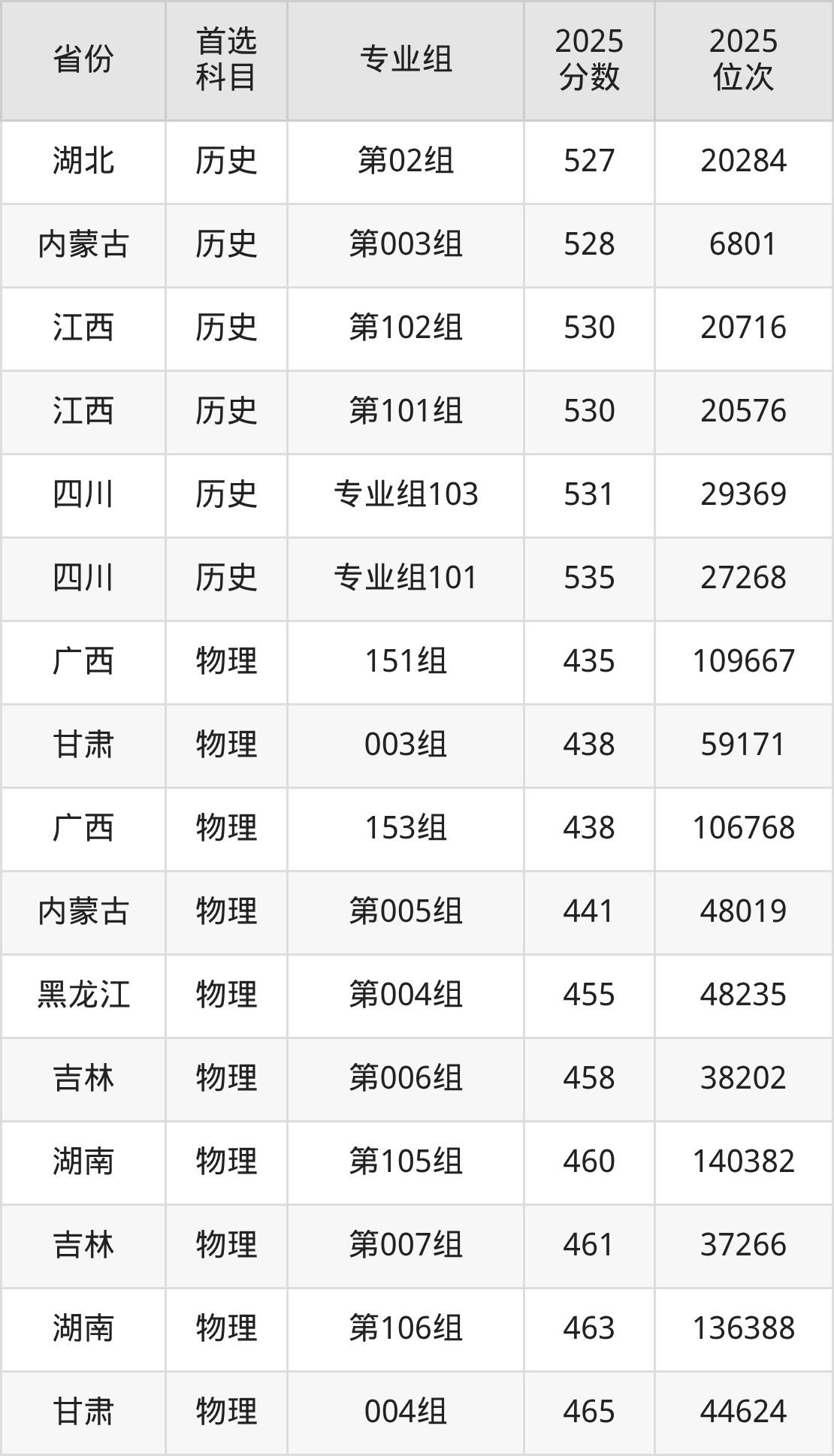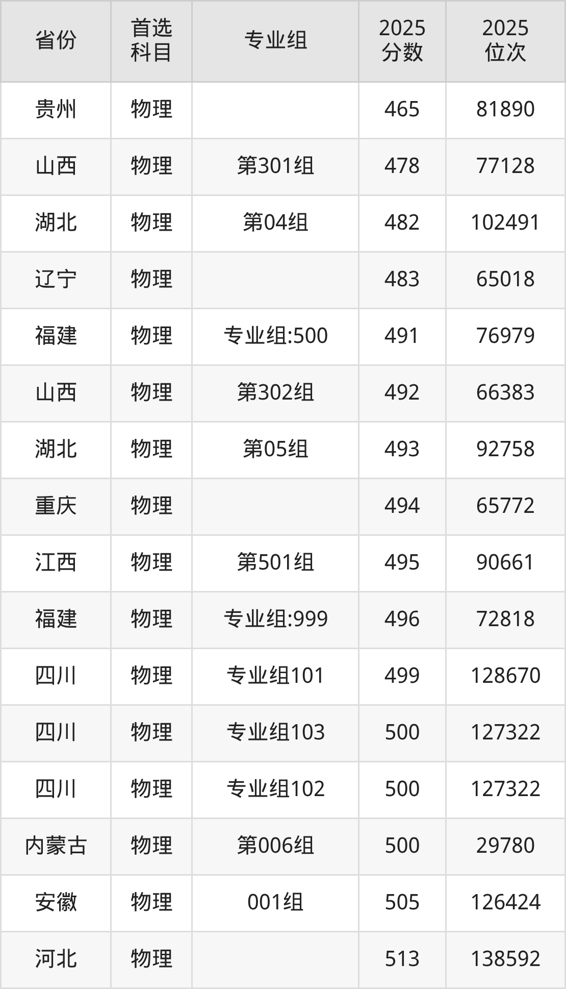物理类最低分对应地区为广西(151组),录取位次为109667,超本科线65分;最高分对应地区为河北,录取位次为138592,超本科线56分。