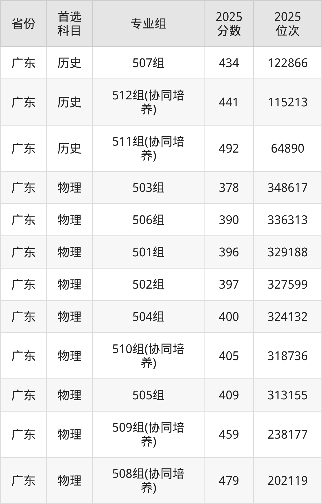 历史类最低分对应地区为广东(507组),录取位次为122866,超专科线219分;最高分对应地区为广东(511组(协同培养)),录取位次为64890,超专科线277分。