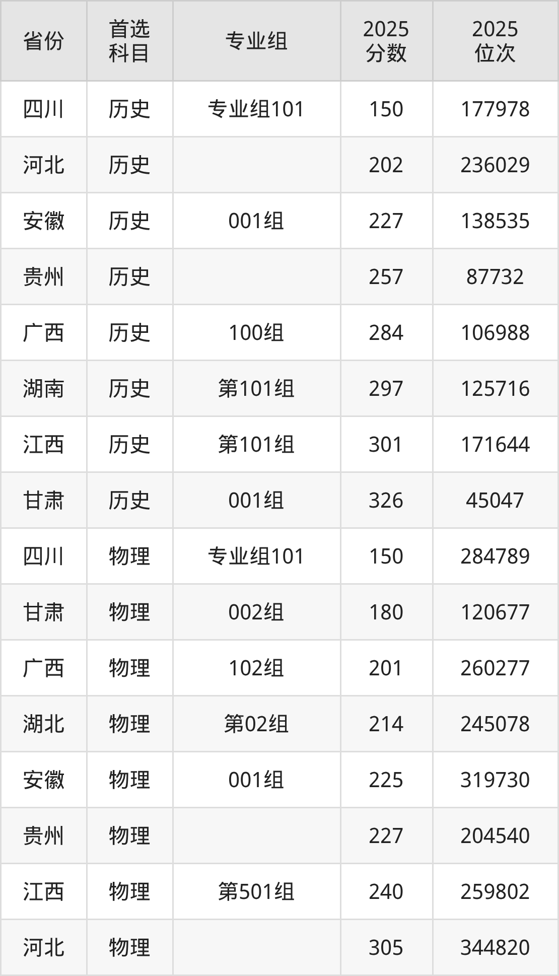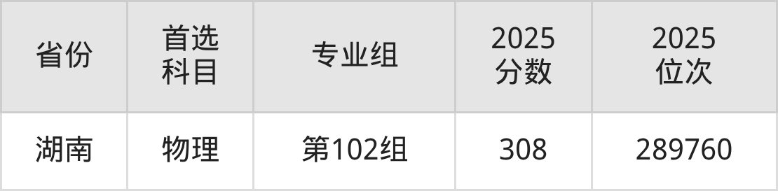 物理类最低分对应地区为四川(专业组101),录取位次为284789;最高分对应地区为湖南(第102组),录取位次为289760,超专科线108分。