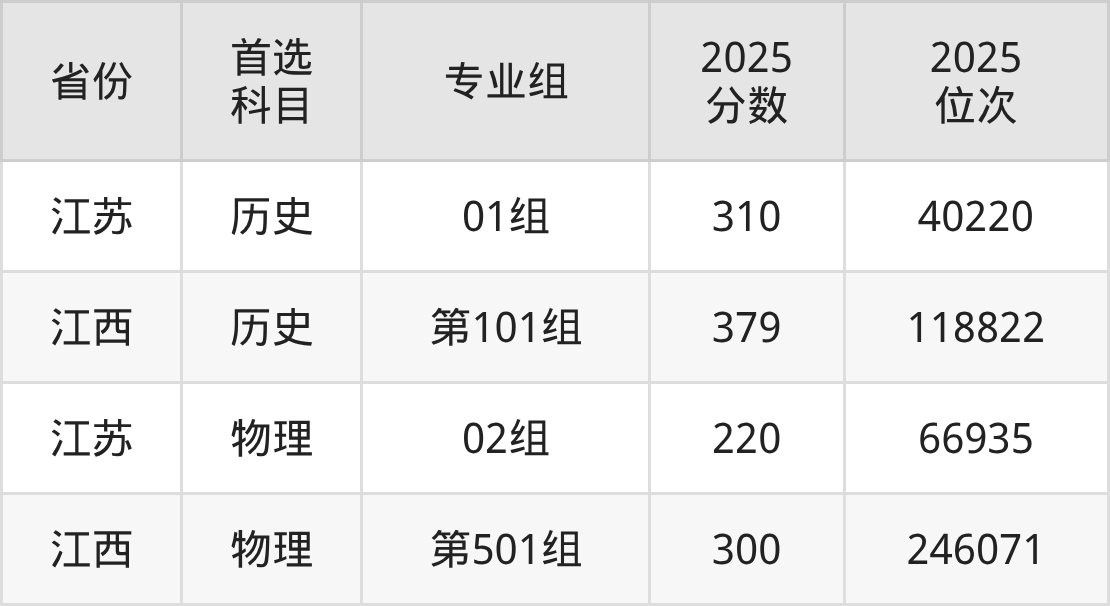 历史类最低分对应地区为江苏(01组),录取位次为40220;最高分对应地区为江西(第101组),录取位次为118822,超专科线89分。