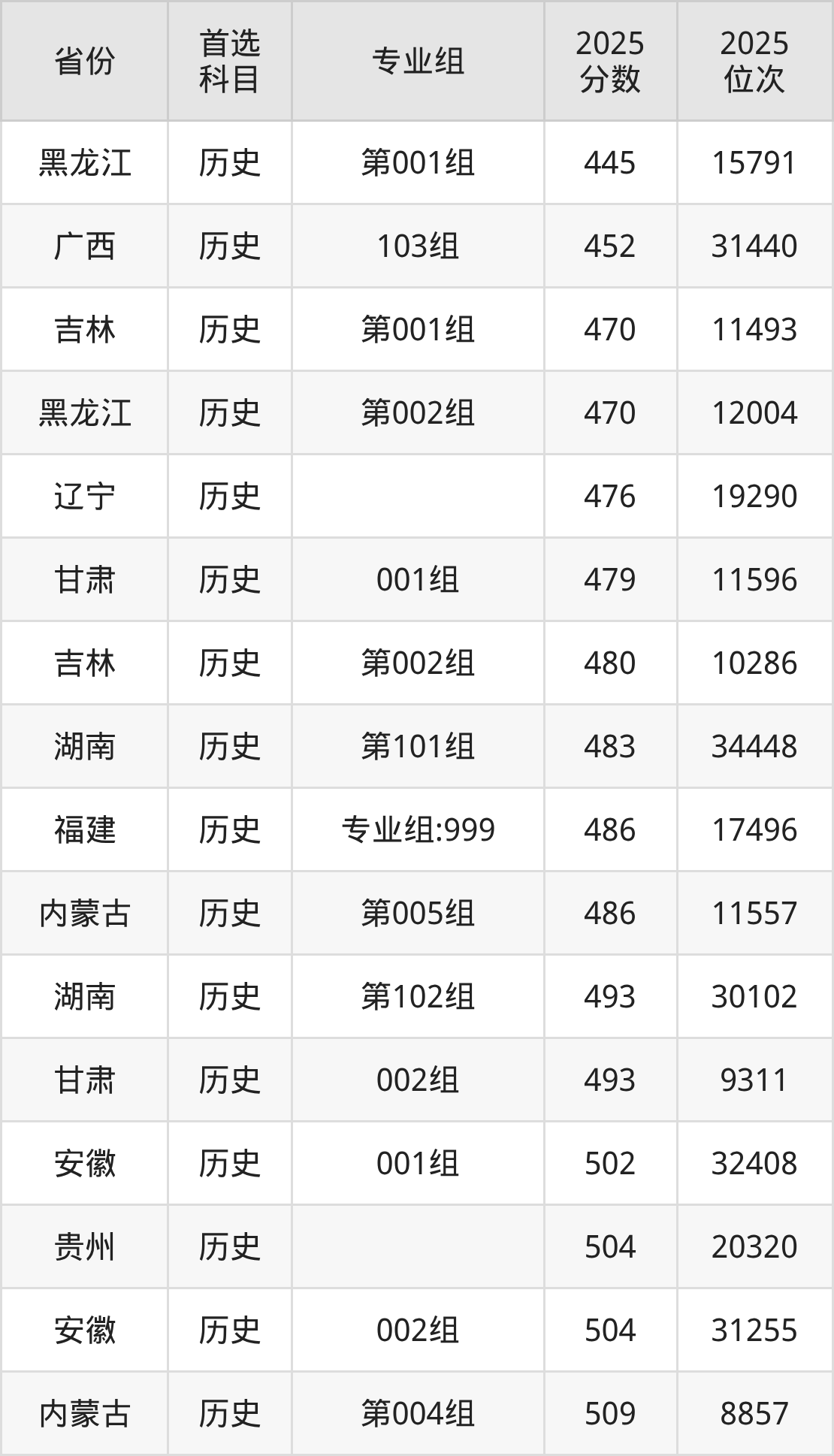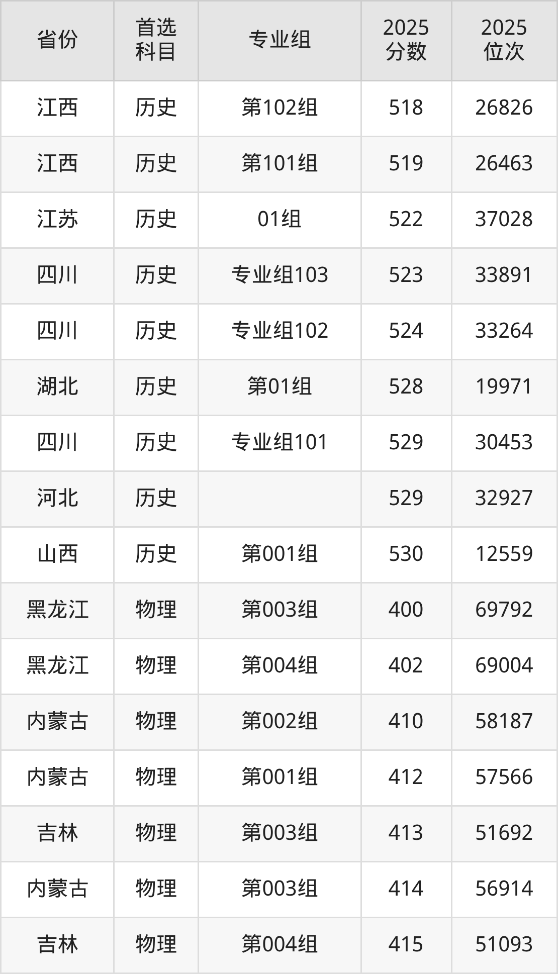 历史类最低分对应地区为黑龙江(第001组),录取位次为15791;最高分对应地区为山西(第001组),录取位次为12559,超本科线87分。