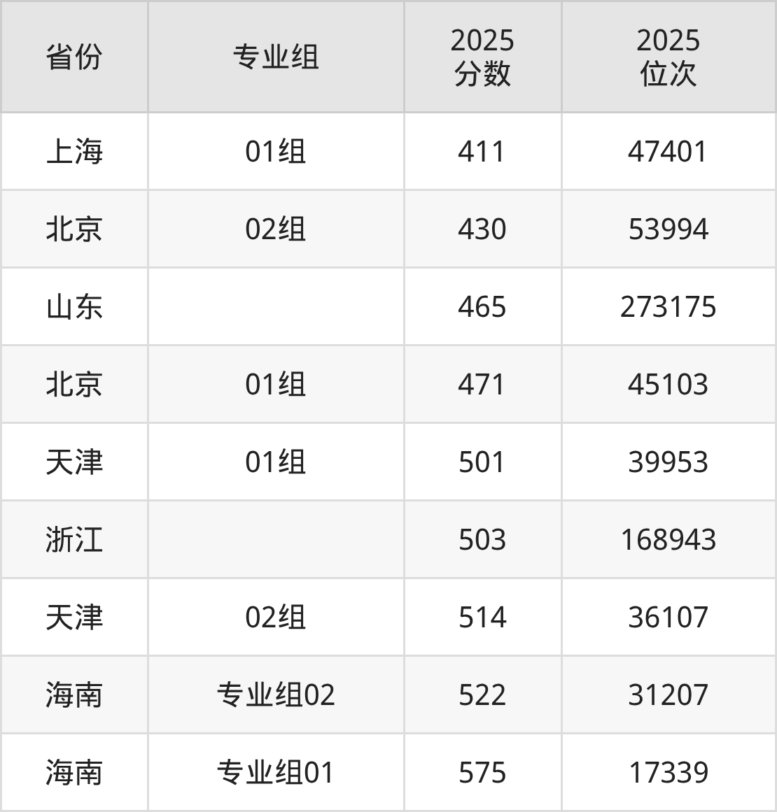 最低分对应地区为上海(01组),录取位次为47401,超本科线9分;最高分对应地区为海南(专业组01),录取位次为17339,超本科线95分。