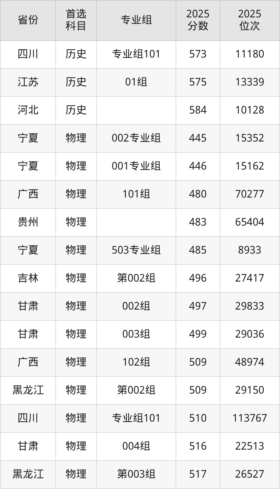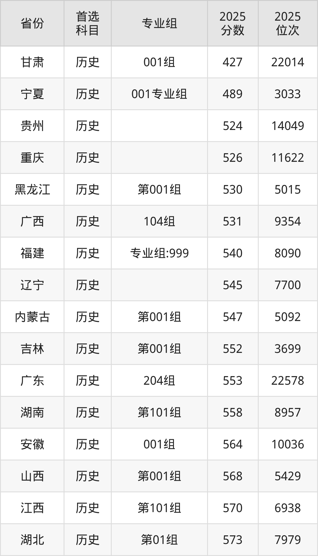历史类最低分对应地区为甘肃(001组),录取位次为22014,超本科线15分;最高分对应地区为河北,录取位次为10128,超本科线107分。